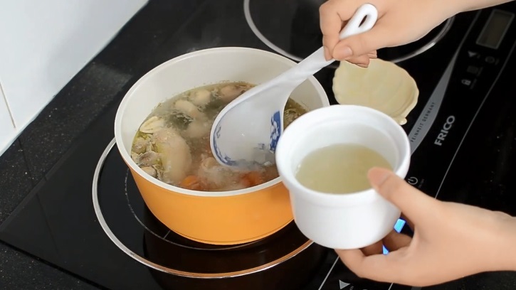 Bước 3: Sau khi có được nước dùng gà, nêm nếm vừa ăn, ta lấy nước dùng này cho vào thố yến để chưng cách thủy.