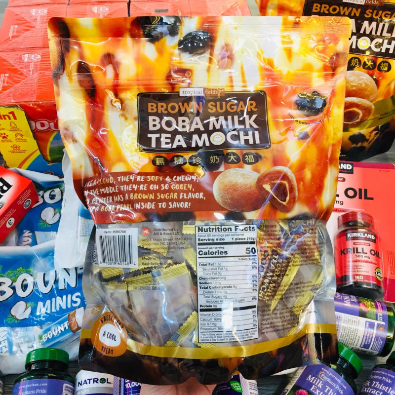 Tropical Fields Brown Sugar Boba Milk Tea Mochi - Mỗi chiếc bánh mochi mềm, dai được làm từ bột gạo nếp với nhân đường nâu và trân châu trân châu ở giữa. Bạn có thể cho vào ngăn đá tủ lạnh để có một món ăn mát lạnh sảng khoái nhé! Mỗi chiếc mochi được đóng gói riêng để đảm bảo độ tươi ngon và thuận tiện cho việc mang theo đồ ăn nhẹ!(A)