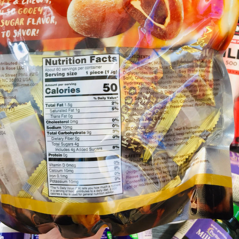Maltose, gạo nếp, nước, đường, trehalose, hydroxypropyl distarch photphat làm chất làm đặc, bột ca cao, nhân sữa (dầu thực vật (dầu cọ, dầu đậu nành) đường, sữa bột nguyên chất, lactose (sữa), bơ ca cao, đậu nành lecithin & mono và diglyceride làm chất nhũ hóa, hương vị nhân tạo, muối, vanillin), đường nâu, dầu cọ, xi-rô đường caramen, mono-và diglyceride làm chất nhũ hóa, muối, hương vị nhân tạo, kali sorbate làm chất bảo quản, tinh bột khoai tây.