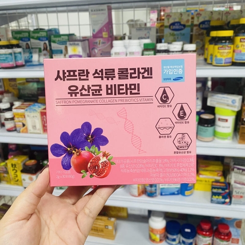 - Bột Uống Collagen Và Vitamin Korea Bio Health Saffron Pomegranate Collagen Prebiotics Vitamin là dòng sản phẩm bổ sung Collagen dạng bột của Korea Bio Health với chiết xuất nhụy hoa nghệ tây saffron, nước ép lựu cô đặc và collagen phân tử nhỏ giúp cơ thể hấp thụ các chất dinh dưỡng nhanh chóng, hỗ trợ thải độc, tăng cường nội tiết tố, giúp chống lão hóa đem lại làn da tràn đầy sức sống.
