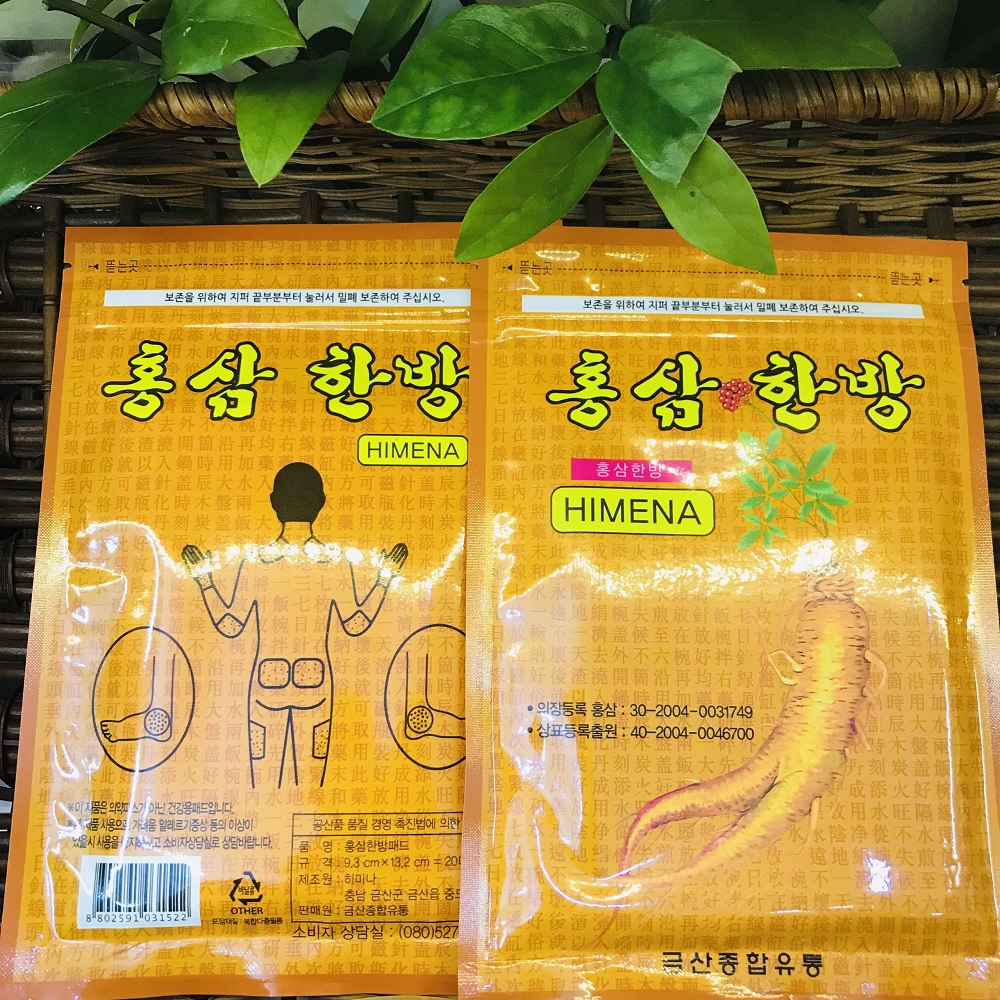 ✔ Miếng cao dán hồng sâm Himena trị nhức mỏi Hàn Quốc chứa tinh chất sâm cùng tá dược giúp làm giảm đau, nhức mỏi gân cơ, đau do thay đổi thời tiết, hoặc do vận động quá sức, đau đầu, đau vai, đau lưng, đầu gối,...
