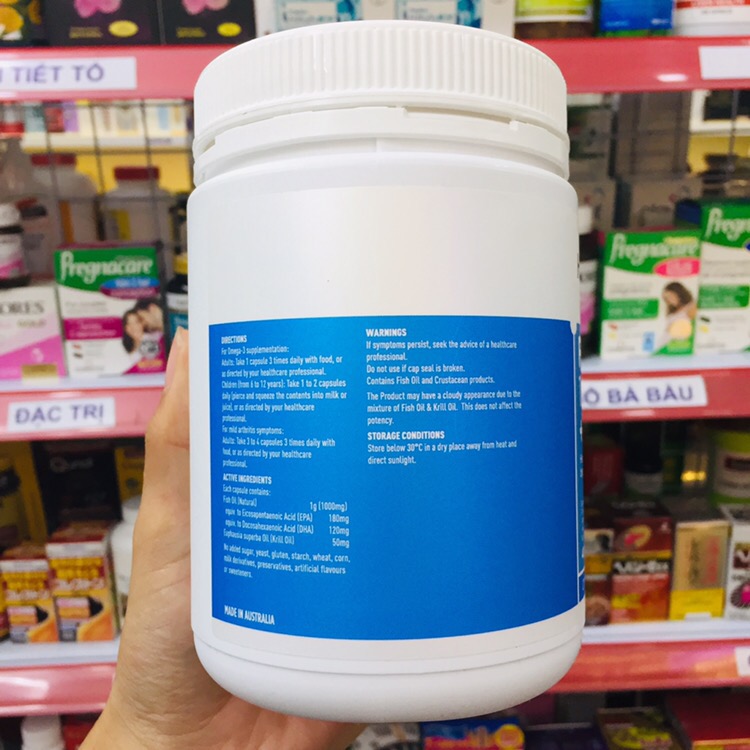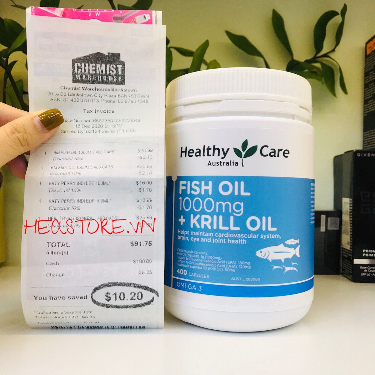 Healthy Care Fish Oil 1000mg & Krill 400 Capsules chứa liều lượng dầu cá 1000mg cộng 50ml dầu nhuyễn thế, cung cấp nhiều axit béo omega-3 và lợi ích sức khoẻ hơn so với dầu cá thông thường.