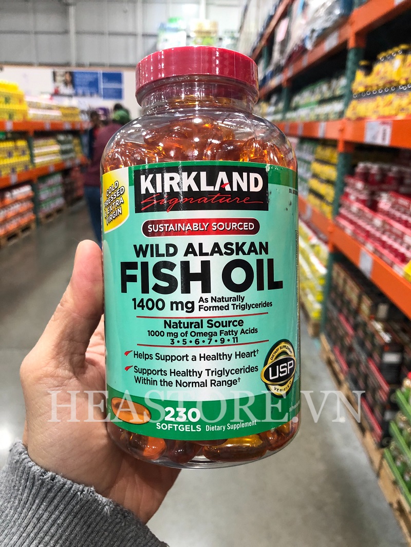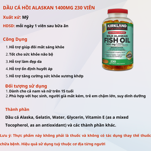 - Dầu Cá Kirkland Wild Alaskan Fish Oil 1400mg hàm lượng axit béo là 1400mg, thiết kế 230 viên/hộp, sản xuất và đóng gói tại Mỹ.