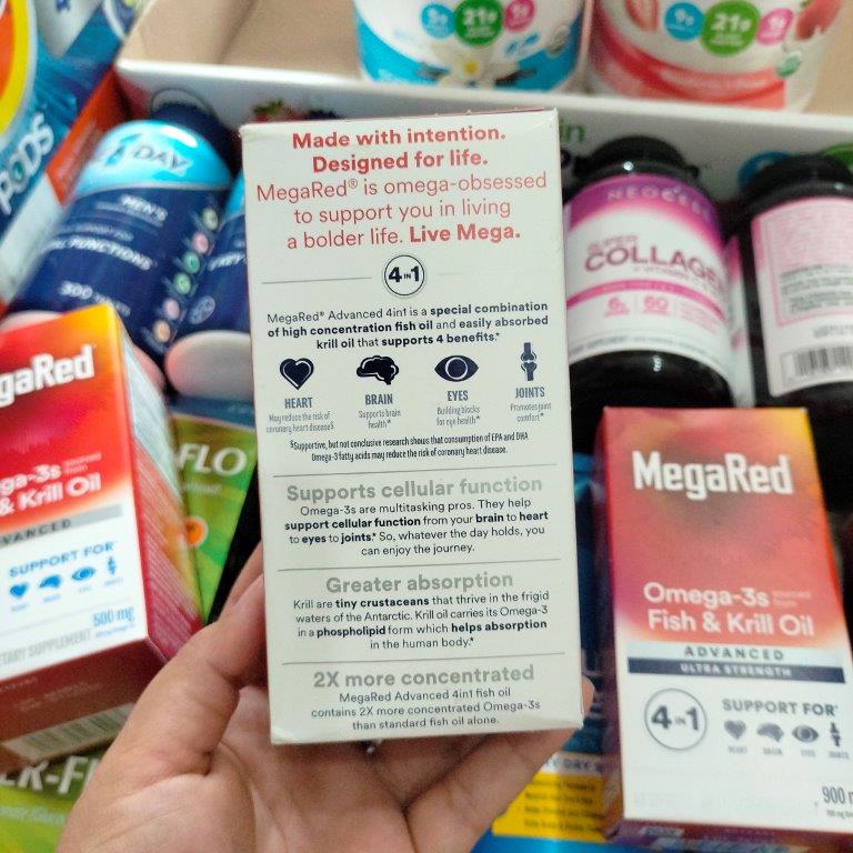 MegaRed Advanced 4in1 chứa hỗn hợp dầu cá nồng độ cao và dầu nhuyễn thể hấp thụ cao giúp làm giảm nguy cơ mắc bệnh tim mạch vành. MegaRed Advanced 4in1 cung cấp axit béo Omega-3 quan trọng EPA và DHA mà dầu nhuyễn thể MegaRed giúp cơ thể bạn để hấp thụ một cách nhanh chóng và dễ dàng.