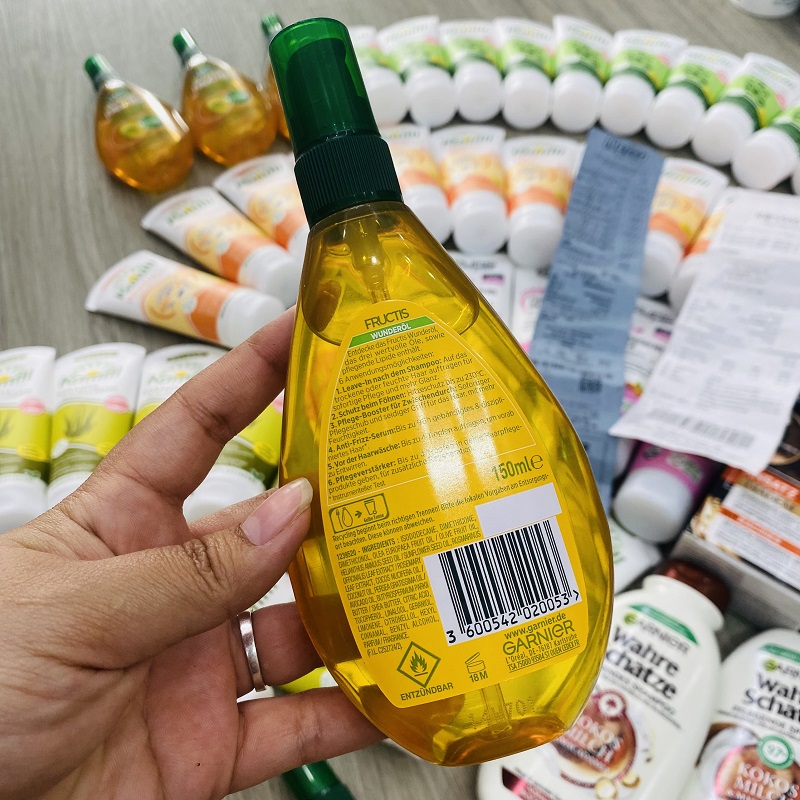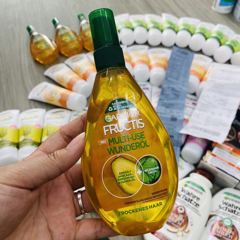–Tinh dầu dưỡng tóc garnier multi-use wunderol - 150ml: Với chiết xuất hoàn toàn từ thiên nhiên chuyên dành cho tóc khô,chẻ ngọn và hư tổn. Bôi sau khi sấy sẽ mang lại mái tóc bóng mượt ngay lập tức với hương thơm dịu nhe. Tinh dầu dưỡng tóc Garnier với hiệu lực kép cùng sữa dưỡng cho mái tóc mềm mại trong giây lát. Tinh chất nuôi dưỡng mái tóc từ sâu bên trong không gây rối, không bị nhờn.