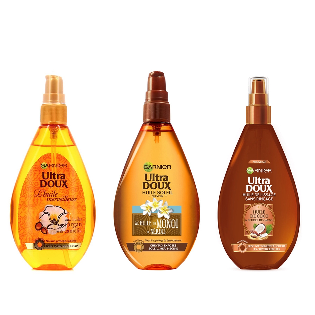 – Tinh Dầu Dưỡng Tóc Garnier Ultra Doux Huile Soleil - 150ml: Với thành phần chính là dầu monoi hòa quyện cùng chiết xuất từ hoa cam có tác dụng nuôi dưỡng mái tóc sáng bóng và khỏe mạnh, hỗ trợ bảo vệ tóc dưới tác hại của tia cực tím.