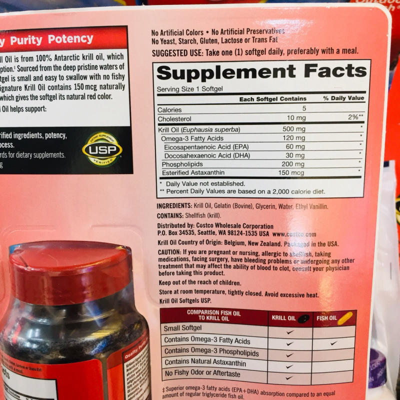 Thành phần dầu nhuyễn thể Kirkland Signature Krill Oil 500mg