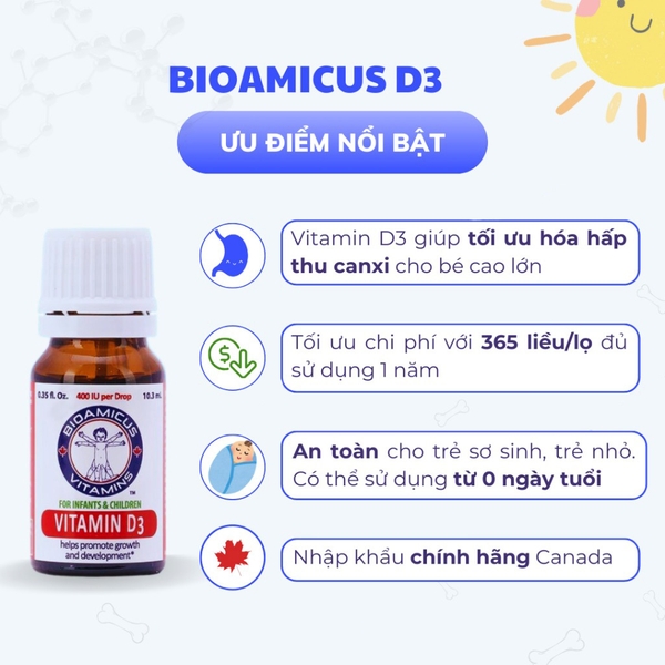 Dung dịch Bioamicus Vitamin D3 là sản phẩm bổ sung vitamin D3 giúp hỗ trợ hấp thu canxi, phát triển xương và răng cho trẻ nhỏ. Được nghiên cứu và phát triển bởi thương hiệu Bioamicus, sản phẩm có thành phần thuần khiết, không chứa chất bảo quản, không gây dị ứng, phù hợp với trẻ sơ sinh và trẻ nhỏ.