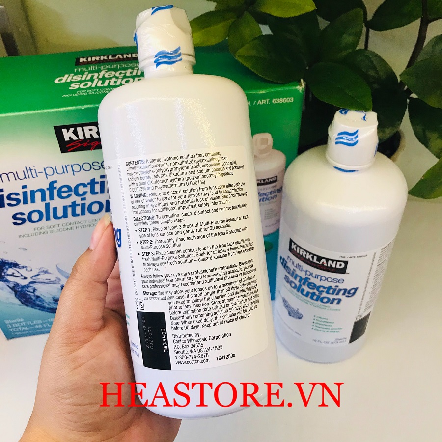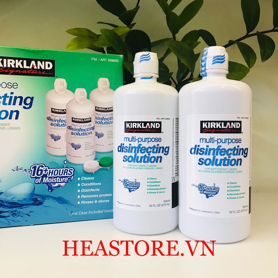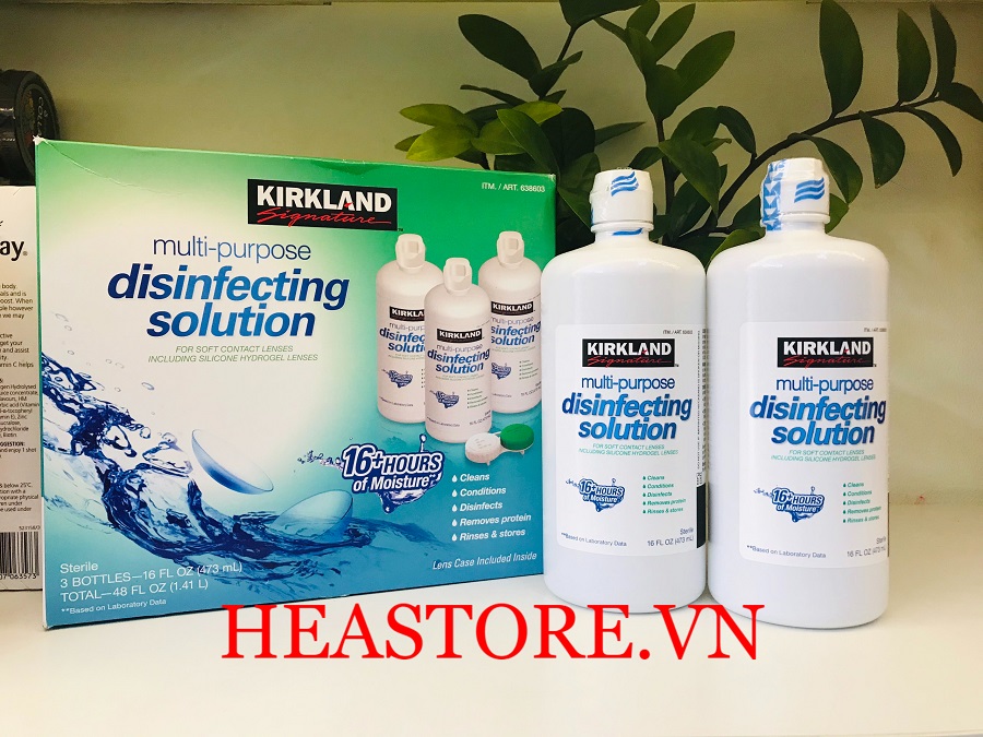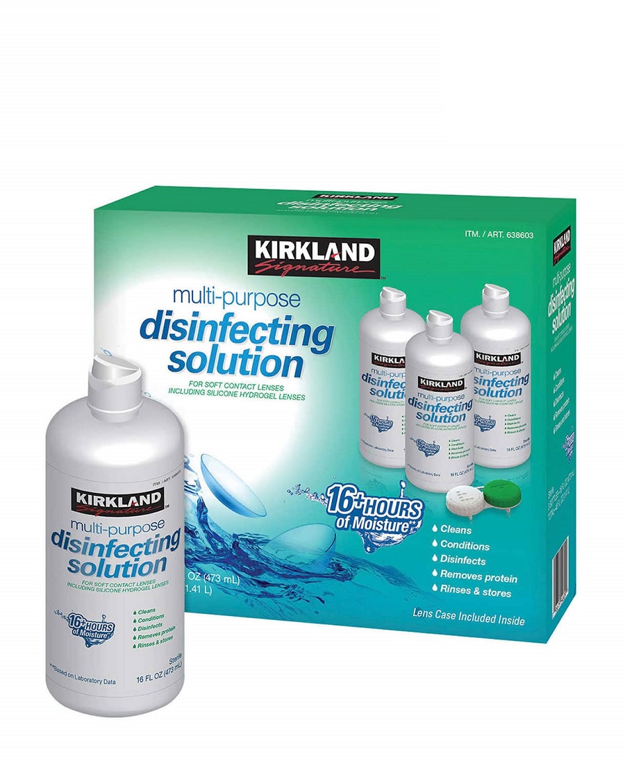Kirkland Multi-Purpose Solution giúp làm sạch, bảo quản trong môi trường phù hợp, khử trùng, loại bỏ protein, làm nước rửa và lưu trữ cho tất cả các loại kính áp tròng mềm bao gồm cả kính silicone hydrogel.
