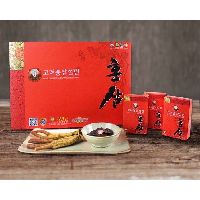 Hồng sâm dẻo tẩm mật ong cắt lát là củ hồng sâm được chế biến bằng phương pháp hấp cách thuỷ,sau đó tẩm mật ong rừng nguyên chất,hồng sâm lát không những là một thực phẩm bồi bổ cơ thể mà còn được xem là một vị thuốc quý vì vậy rất tốt cho mọi đối tượng đặc biệt là những người lớn tuỏi,sức khoẻ suy giảm và những người đang trong thời kỳ phục hồi sức khoẻ sau khi bị bệnh.