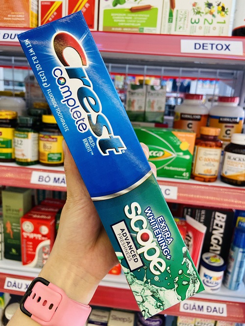 Với combo tối ưu của 30% tinh chất làm trắng* và hơn 15% hương Scope**, kem đánh răng Crest Complete Multi-Benefit Extra Whitening + Scope cung cấp sức mạnh loại bỏ mảng bám cho răng trắng hơn và hơi thở thơm mát mùi Scope chỉ trong một tuýp kem đánh răng. Nó bảo vệ khỏi sâu răng, ngăn ngừa cao răng, cho răng trắng và sạch hơn, giúp loại bỏ mảng bám trên bề mặt, giữ cho hơi thở của bạn thơm mát mùi bạc hà.