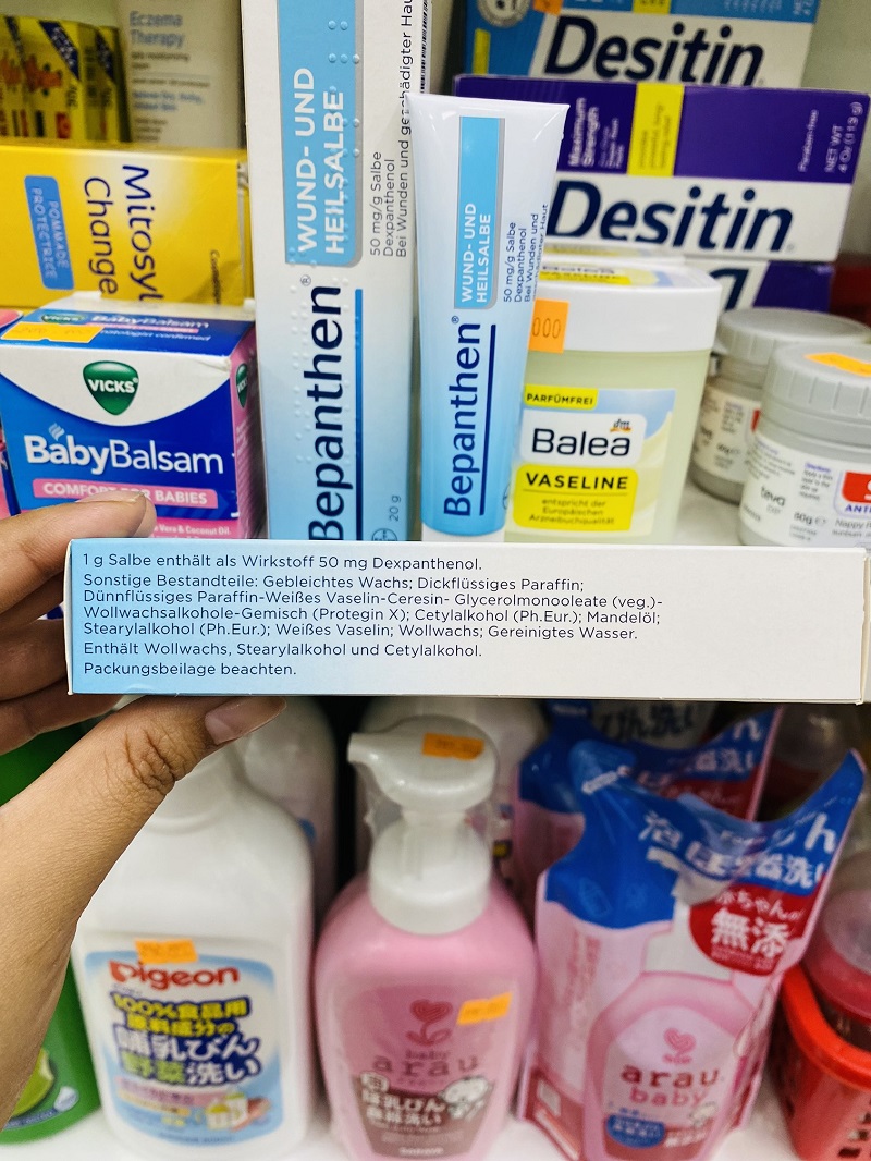 - Kem trị hăm Bepanthen có chứa Dexpanthenol (hoặc tiền vitamin B5), cung cấp các yếu tố cần thiết cho sự tái sinh của da.