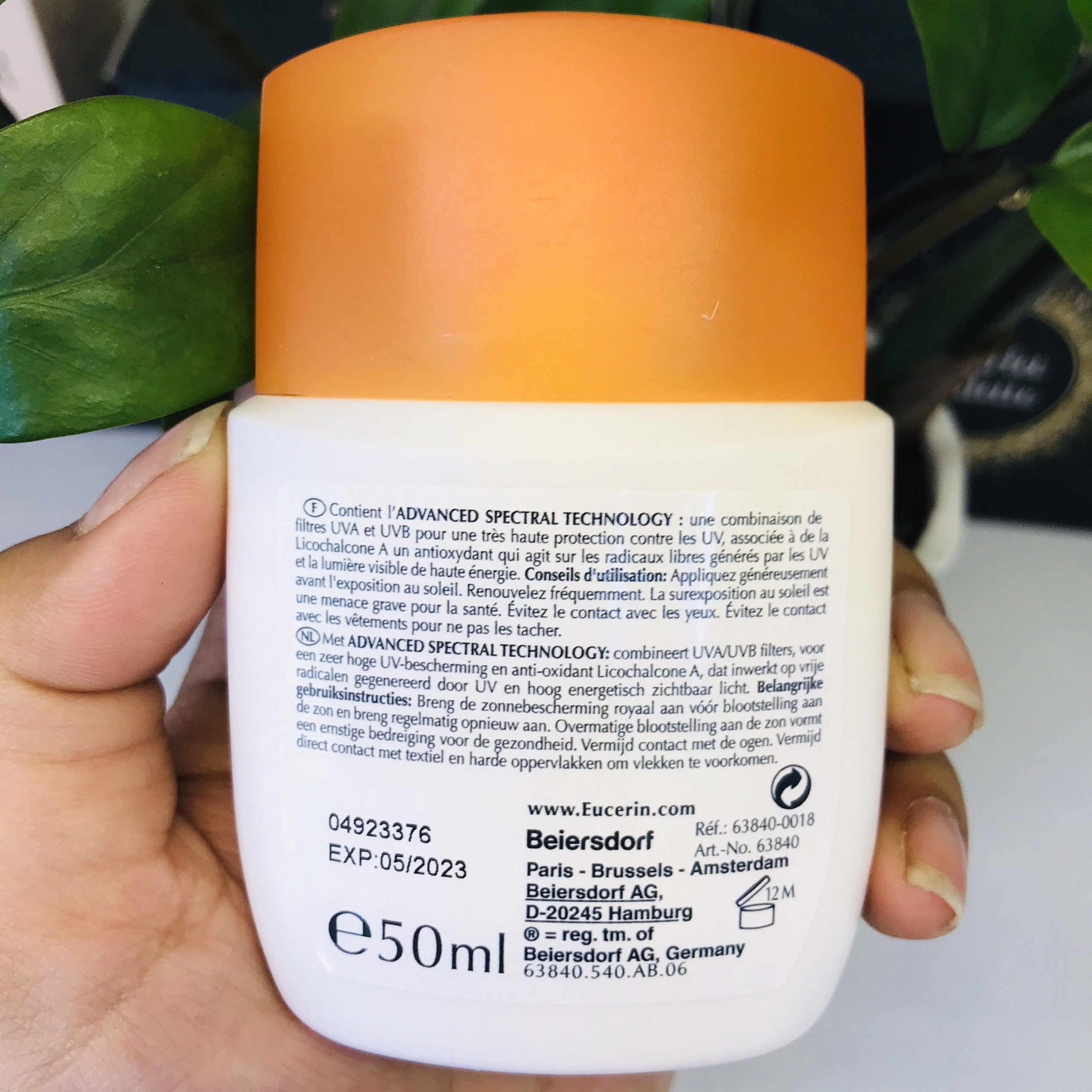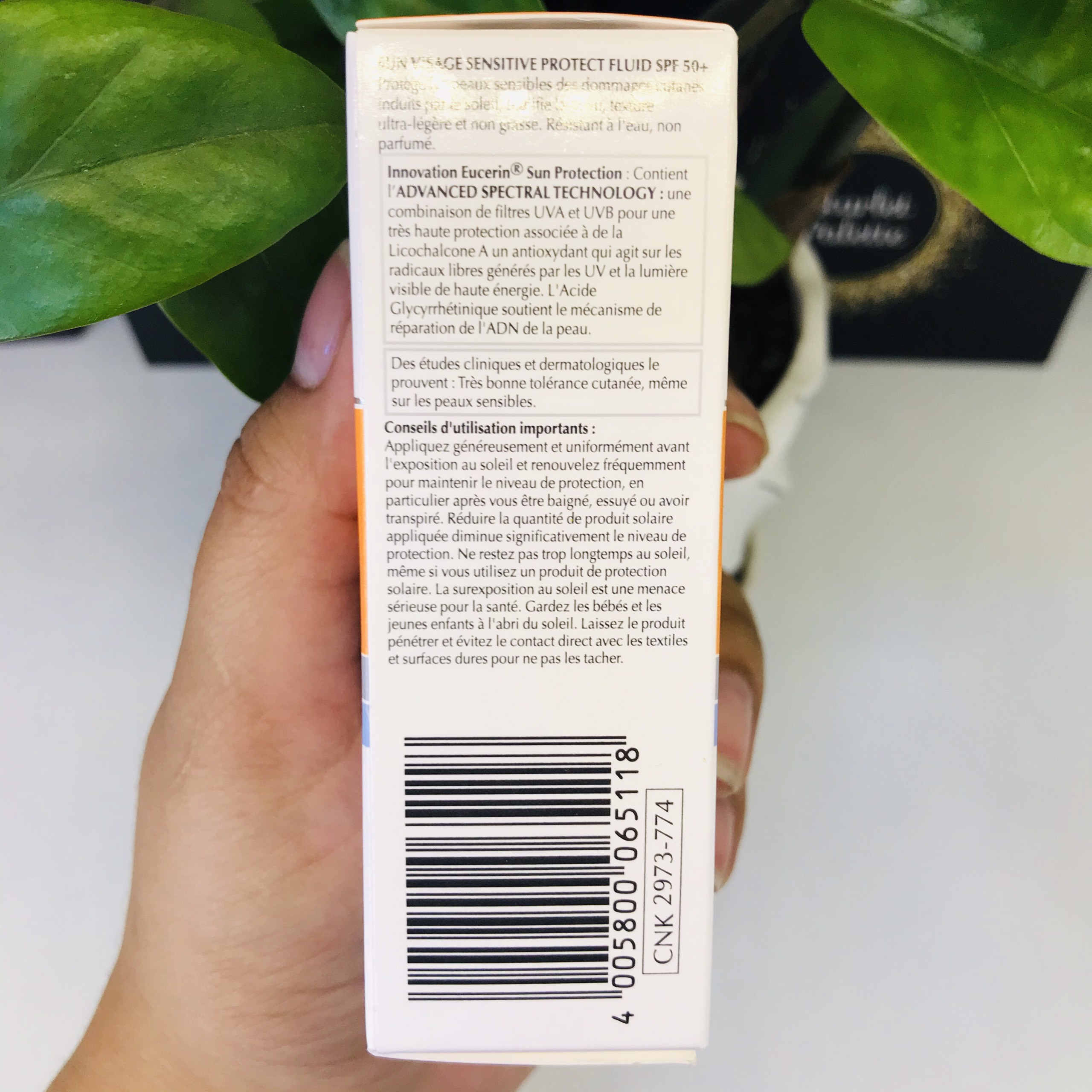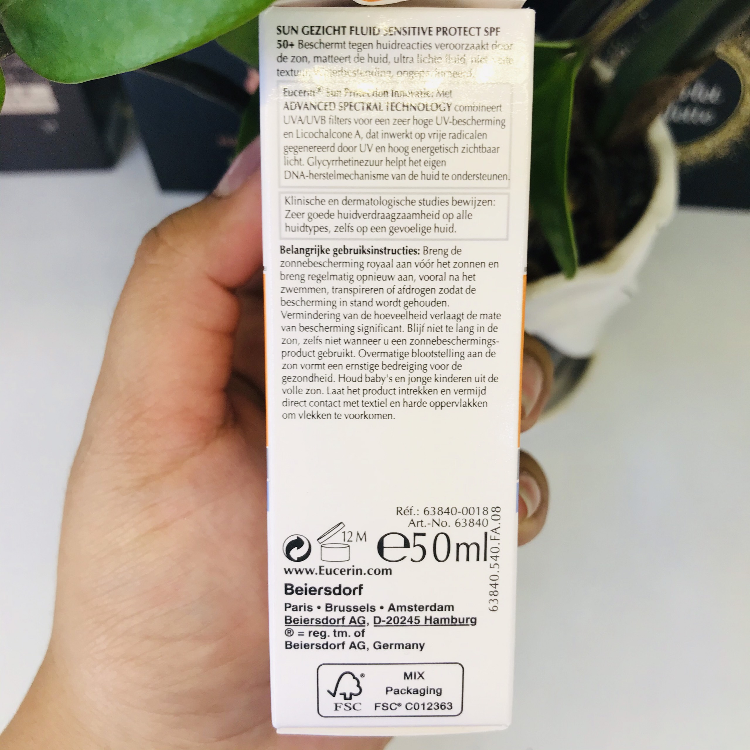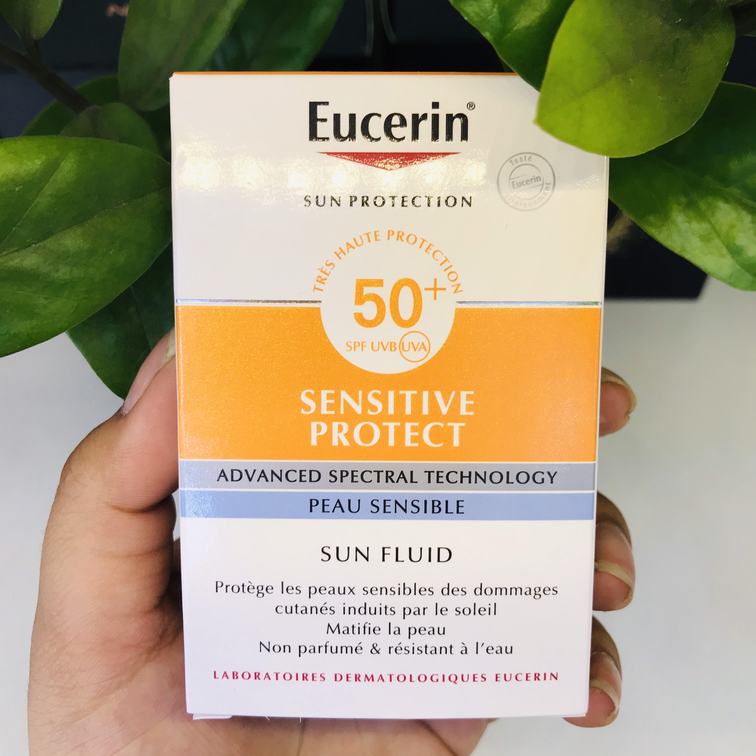 Kem chống nắng Eucerin Sensitive Protect Sun Fluid SPF 50+_Dành cho da thường đến da hỗn hợp, phù hợp cho cả da nhạy cảm và sau khi điều trị bằng hóa chất hoặc laser, được chứng minh hiệu quả dựa trên các nghiên cứu lâm sàng của hãng trên da của người bị mụn khi tình nguyện sử dụng kem chống nắng này