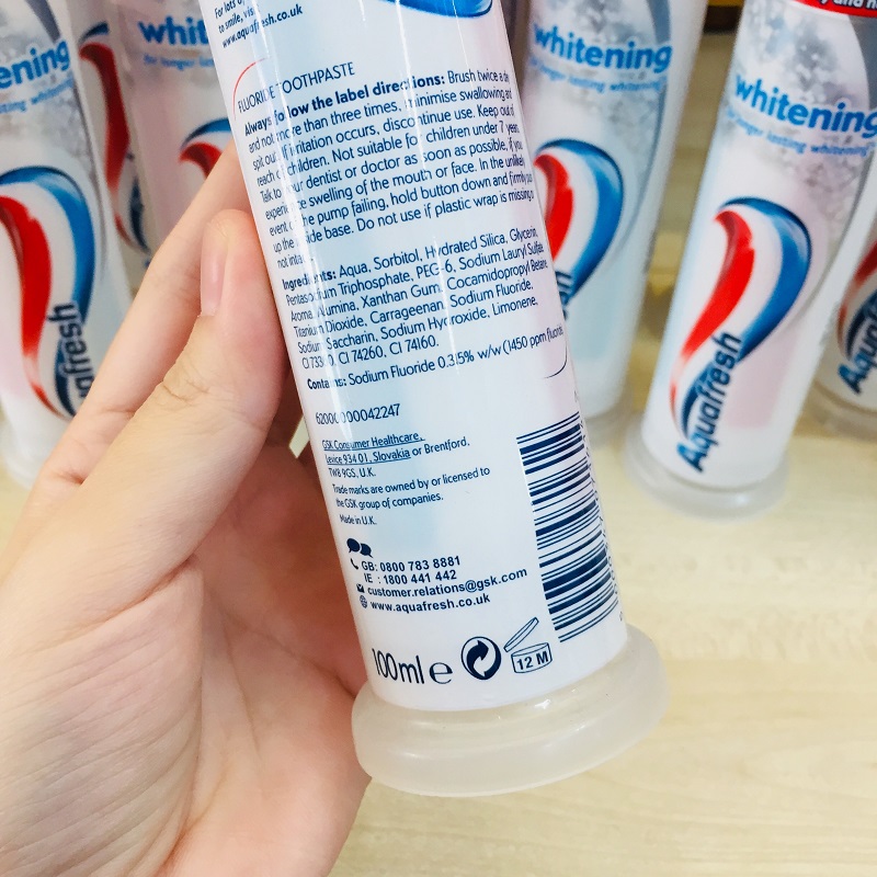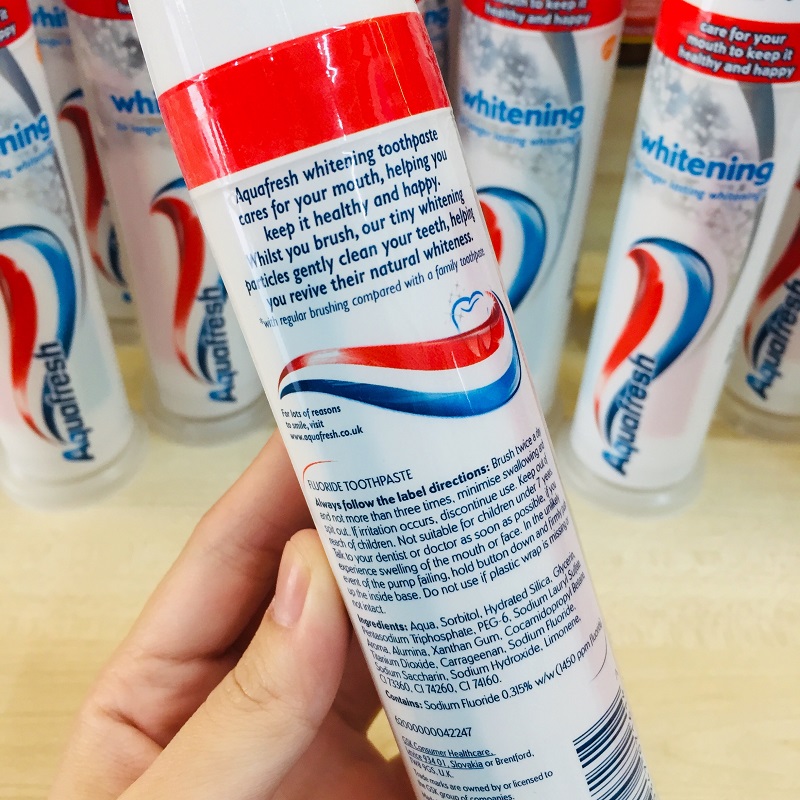 Kem Đánh Răng Aquafresh Whitening là kem đánh răng giúp chăm sóc và bảo vệ răng miệng, cho bạn hàm răng trắng sáng, chắc khỏe, hơi thở thơm tho. Sản phẩm được nhập khẩu từ Mỹ, chứa các thành phần đặc biệt đã được các chuyên gia nha khoa nghiên cứu nhằm đảm bảo chăm sóc răng miệng hiệu quả nhất.