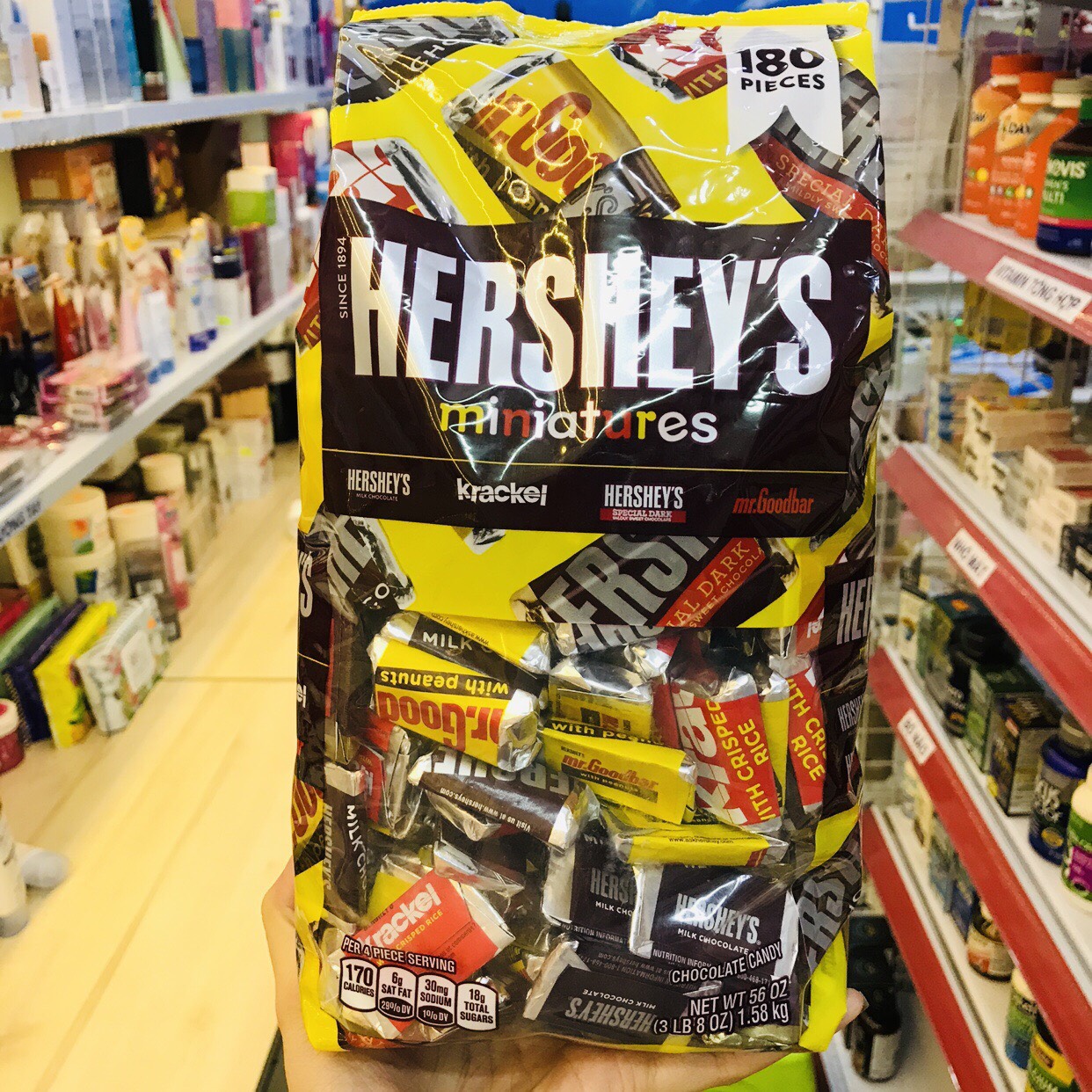 ➤ Sản phẩm được đóng gói 1.58kg với 4 vị chocolate nổi tiếng tạo nên sự hấp dẫn vô cùng lớn khi thưởng thức nó: Hershey’s Crispy (socola nhân bỏng gạo), Hershey’s Special Dark Mildly (có nhân ngọt đắng), Hershey’s Nutty Mr Goodbar (có nhân là đậu phụng), Hershey Creamy (socola sữa). Kẹo chocolate Hersheys Miniature 1.58kg được đóng gói tiện lợi dễ dàng sử dụng và bảo quản, bạn có thể mang theo socola trong những chuyến đi chơi hay dã ngoại để chia sẻ cùng người thân và bạn bè.