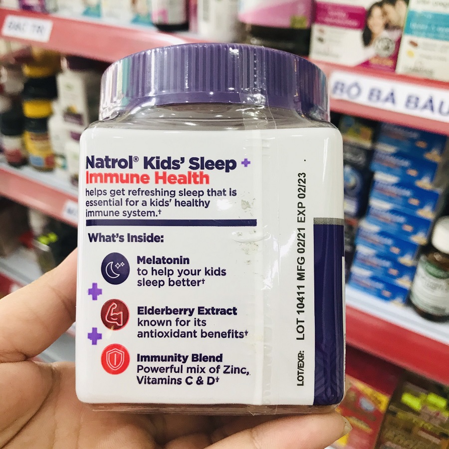 Kẹo dẻo Natrol Kids Sleep+ Immune Health Gummies giúp trẻ đi vào giấc ngủ và ngủ sâu để chúng được nghỉ ngơi cần thiết. Mỗi viên kẹo dẻo giúp bé ngủ ngon Natrol Kids Melatonin Gummies có hương vị quả dâu mọng berry cung cấp 1 mg melatonin.