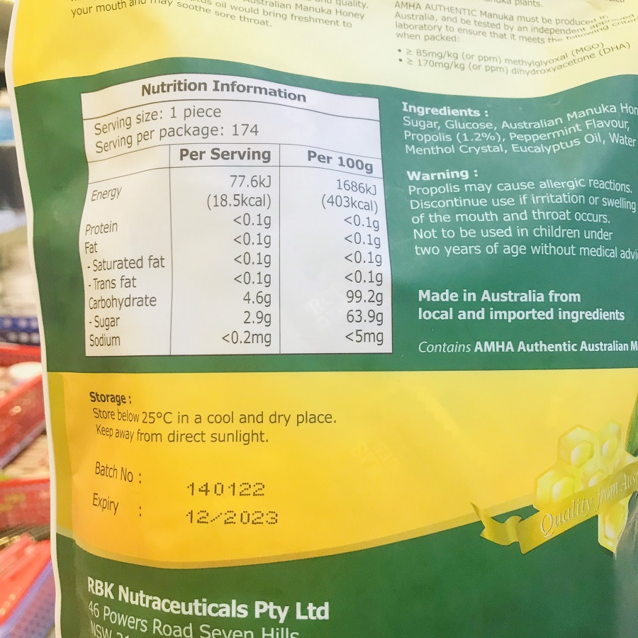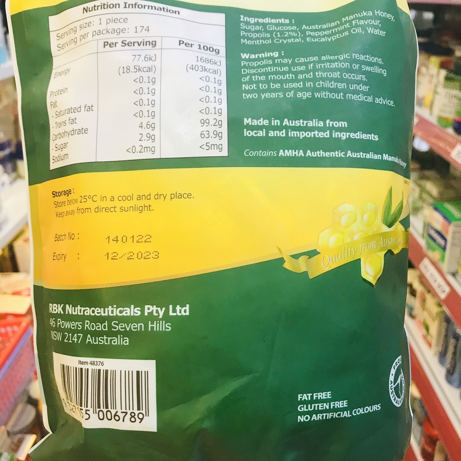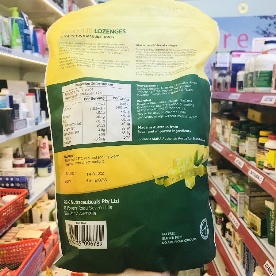 Thành phần: Propolis (1.2%), Glucose, Sugar, Honey, Eucalyptus Oil, Manuka Honey, Peppermint Flavour, Menthol Crystal, Water