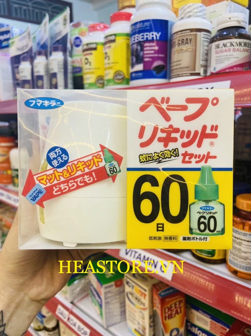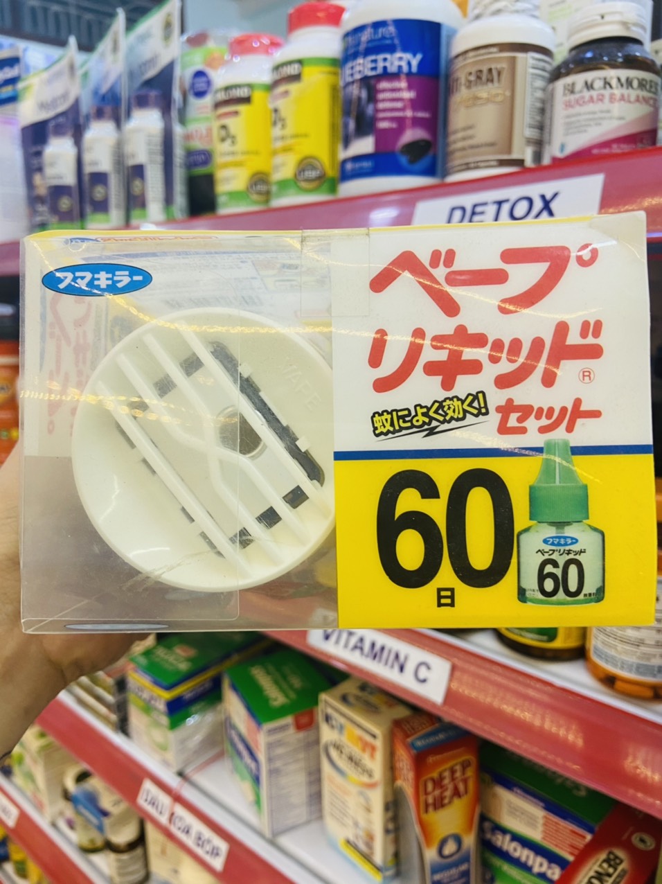 - Đi kèm với máy xông muỗi Nhật là một lọ tinh dầu đuổi muỗi thiên nhiên của Nhật 45ml, dùng cho phòng khoảng 20m2 – 30m2. Một lọ 45ml có thể dùng trong khoảng 700h. Khi hết có thể mua lọ khác thay thế.