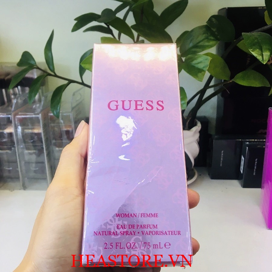 Sau 25 năm xuất hiện, nhãn hiệu Guess đưa ra thị trường một loại nước hoa mới dành cho phụ nữ được gọi đơn giản là Guess. Mùi hương thảo mộc ngọt ngào quyến rũ này dành cho nhưng phụ nữ trẻ ưa mạo hiểm và có tâm hồn tự do. Cô ấy coi trọng các giá trị: sự gợi cảm, sự xác thực, hấp dẫn hợp thời trang và vượt qua các phong tục. Nước hoa Guess đựng trong chai thủy tinh và kim loại có lồng chữ G của thương hiệu này. Mùi hương này bắt đầu với hương thơm ngọt ngào của táo và quýt. Tâm điểm của là mùi hương của đóa hoa Lan Nam phi đẫm sương và hoa mẫu đơn. Sau đó là sự kết hợp sang trọng và hấp dẫn của hương gỗ và xạ hương.