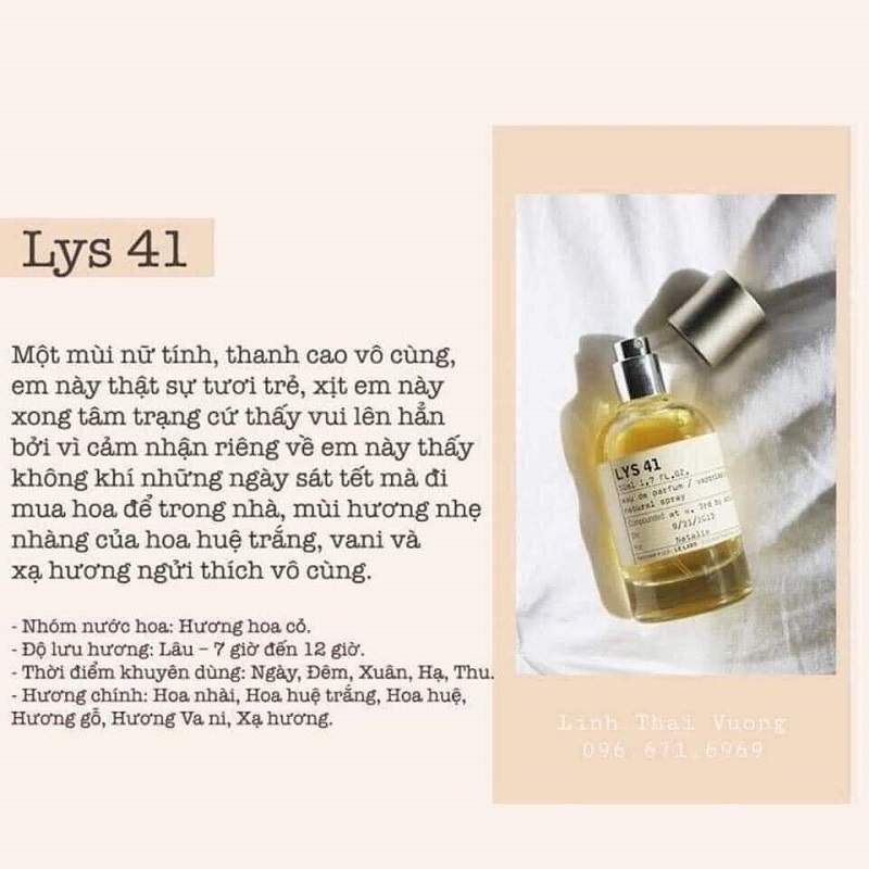 Le Labo Lys 41 là một mùi hương nữ tính, quyến rũ và phù hợp với các cô nàng từ độ tuổi từ 27 trở lên để thể hiện được phong thái chín chắn, trưởng thành và chuyên nghiệp ở môi trương công sở.