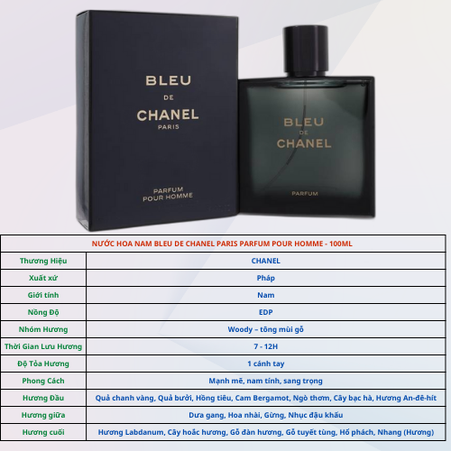 Nước hoa nam Bleu De Chanel Parfum Pour Homme 100ml là mùi hương được ưa chuộng trên toàn cầu của thương hiệu đình đám Chanel, rất xứng đáng để bạn khám phá. Mùi hương mạnh mẽ, phong cách lịch lãm, hiện đại, tự tin, phù hợp với người đàn ông trưởng thành sau 25, lãng tử, tự do.