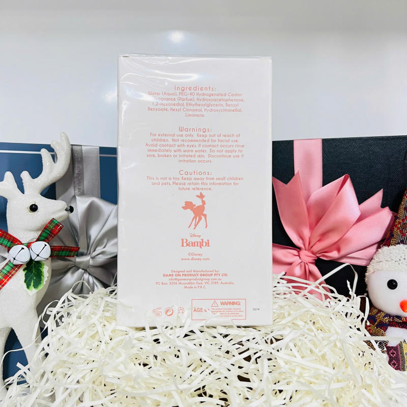 Nước hoa Bambi dành cho nữ là một mùi hương nhẹ nhàng và đáng yêu, lấy cảm hứng từ bộ phim hoạt hình kinh điển của Disney. Mùi hương này mở đầu với các nốt hương của cam quýt tươi mát, gợi lên cảm giác về ngày hè ấm áp. Lớp hương giữa là sự pha trộn của các loài hoa trắng, mang đến sự nhẹ nhàng và nữ tính. Lớp hương cuối là sự kết hợp của gỗ đàn hương, xạ hương và vani, tạo thêm chiều sâu và bền bỉ cho mùi hương.