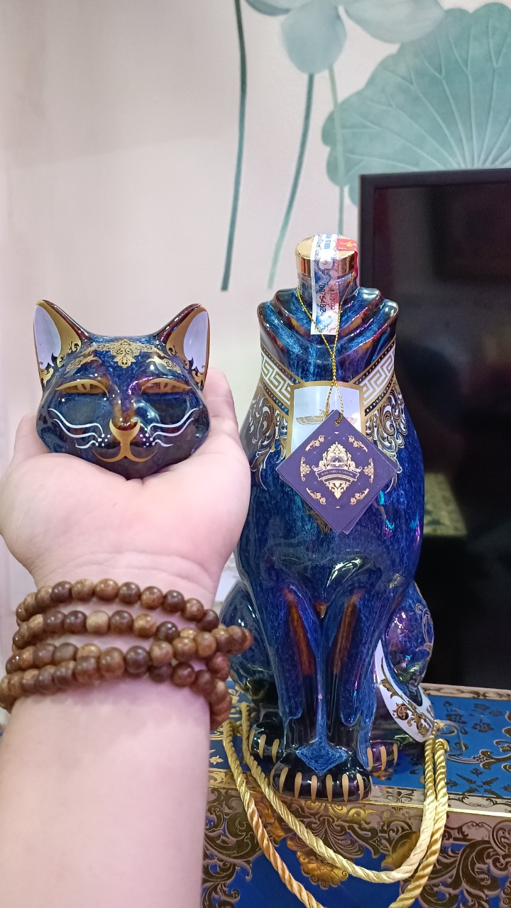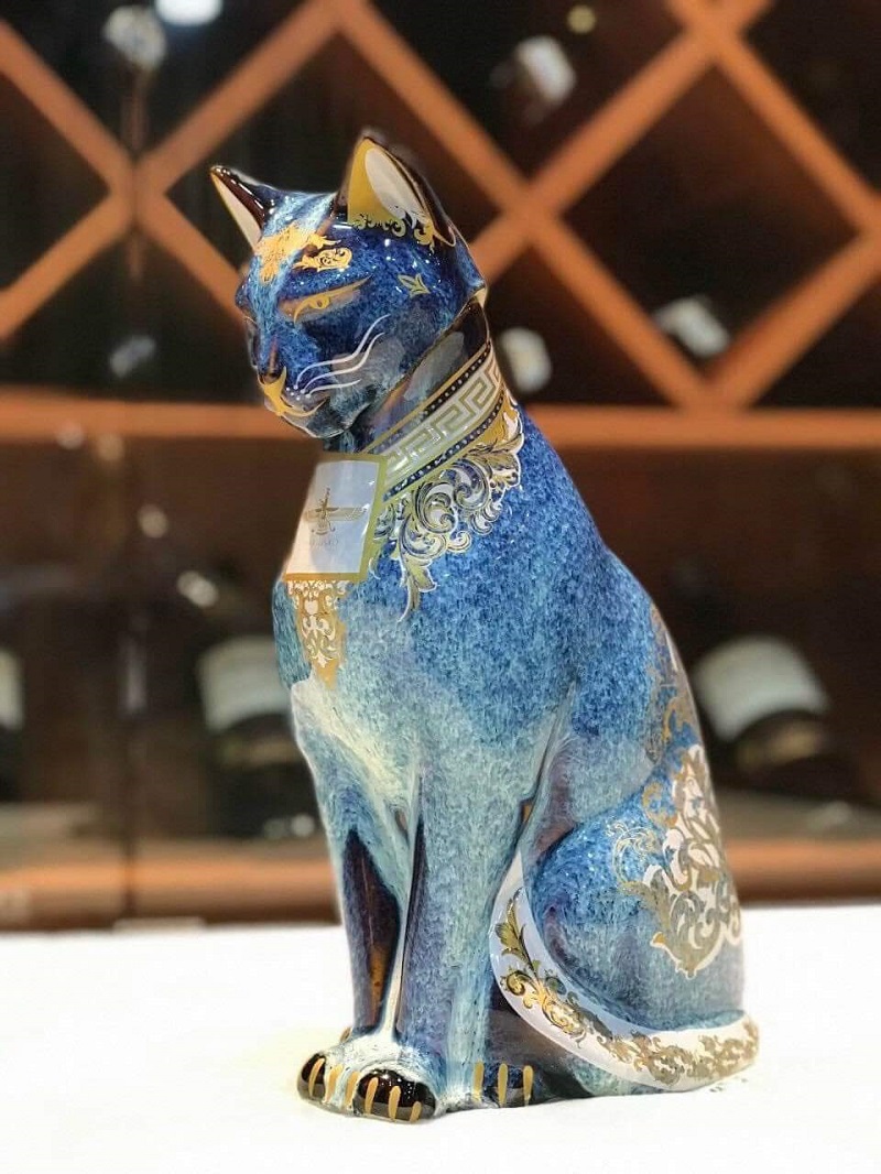 Rượu mèo Ai Cập là tuyệt tác được lấy cảm hứng từ thần thoại Ai Cập cổ đại, chất lượng làm từ gốm sứ cao cấp sơn màu xanh ngọc cùng chất rượu hảo hạng Brandy XO từ tập đoàn Slaur Sardet Pháp cùng vảy vàng 23K nhập khẩu từ Đức tạo nên tác phẩm độc đáo