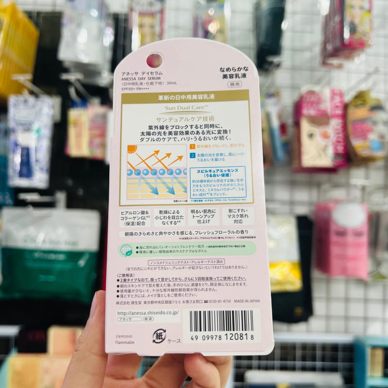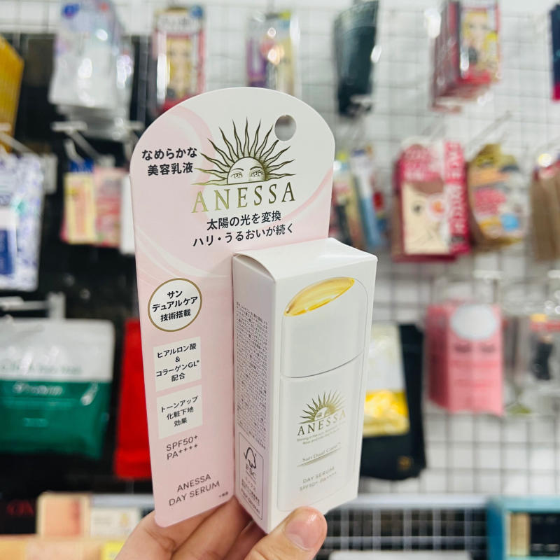 Serum Chống Nắng Hỗ Trợ Dưỡng Da, Nâng Tông Dạng Serum Anessa Day Serum SPF50+/PA++++ là kem chống nắng thuộc thương hiệu Anessa. Với công nghệ chống nắng quang hợp Sun Dual CareTM có khả năng chống nắng và khả năng quang hợp - biến đổi tia UV thành Ánh Sáng Sinh Học nuôi dưỡng da. Đồng thời, duy trì độ ẩm tốt, nâng tông với sắc hồng ngọc trai mang đến cho bạn làn da rạng rỡ, căng mịn.