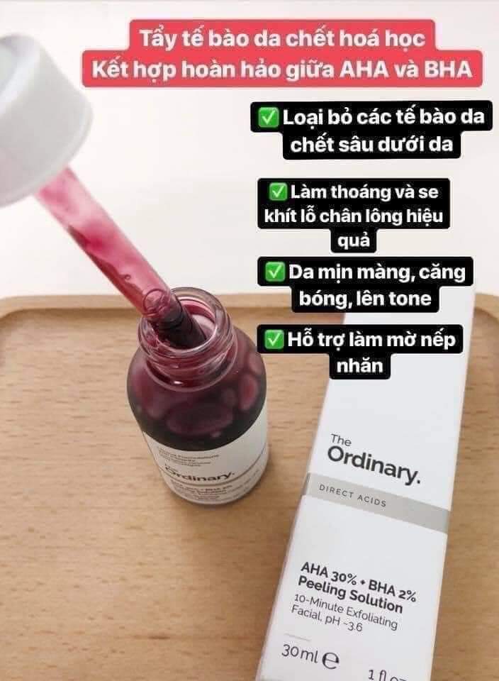 Tinh chất tẩy tế bào chết hóa học The Ordinary AHA 30% + BHA 2% Peeling Solution chứa thành phần gồm các hoạt chất tác dụng mạnh, đem lại hiệu quả cao như: