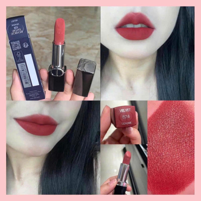 💄 Dior Rouge Velvet 624 Vérone – Sắc đỏ đất cuốn hút, sang trọng, phù hợp với mọi phong cách. Với chất son lì mịn mượt, bám màu tốt, bổ sung dưỡng giúp đôi môi luôn căng mọng, đây chính là thỏi son không thể thiếu trong bộ sưu tập của phái đẹp.