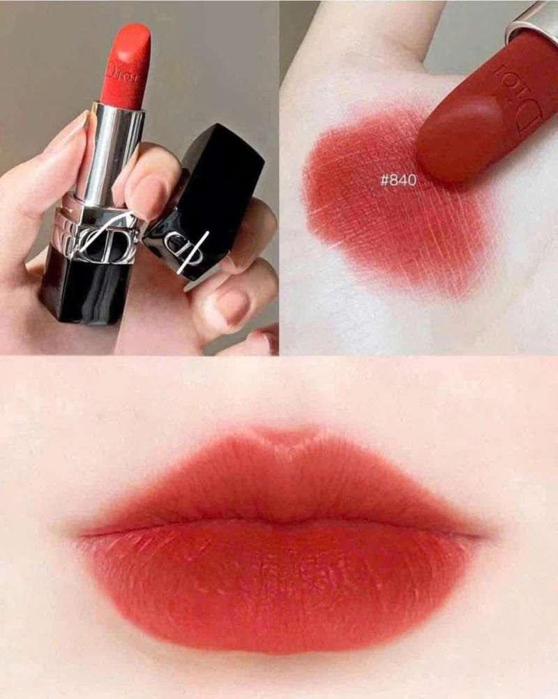💄 Dior Rouge Velvet 840 Rayonannte – Sắc đỏ cam gạch thời thượng, tôn da, phù hợp mọi phong cách. Với chất son lì mịn, bền màu, kết hợp công nghệ dưỡng ẩm giúp môi luôn mềm mại, đây chính là sự lựa chọn hoàn hảo cho những ai yêu thích vẻ đẹp quyến rũ và thanh lịch.