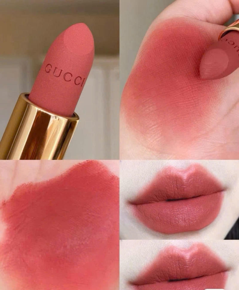 - Gucci Rouge À Lèvres Mat 217 Valeria Rose mang sắc hồng cam đất nhẹ nhàng, thanh lịch.