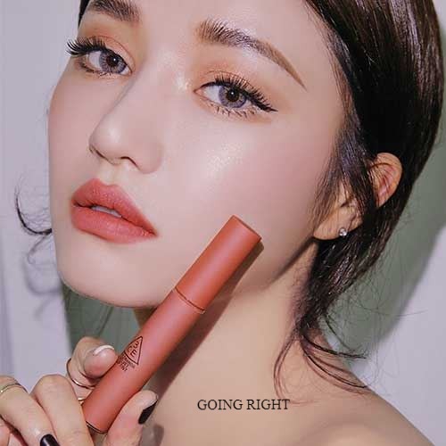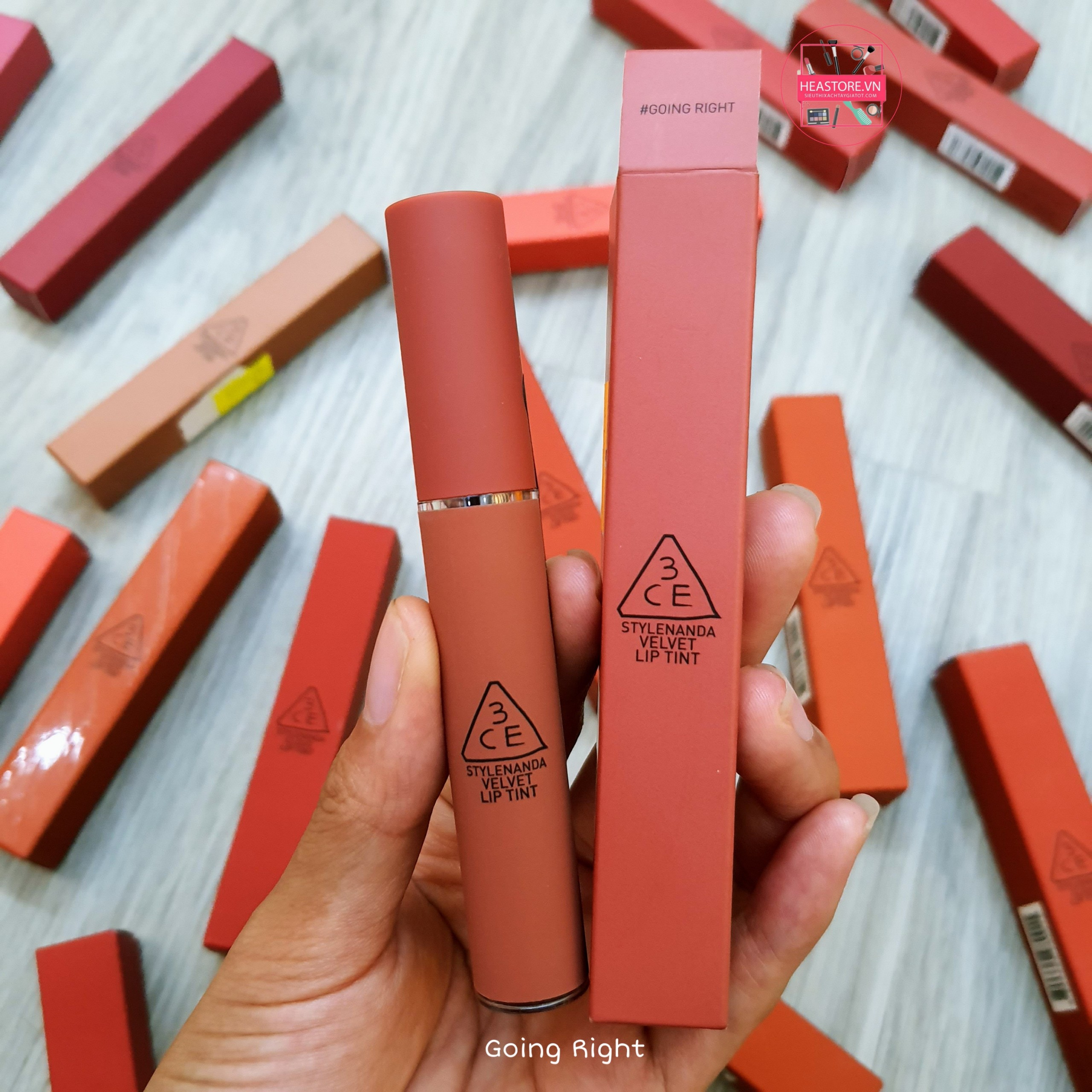 Son kem lì 3CE Velvet Lip Tint Going Right cam hồng đất của son 3CE Velvet Lip Tint có thêm sự góp mặt của tone hồng giúp màu son này trở nên tươi tắn và nổi bật hơn hẳn ,được dự đoán sẽ là một trong những màu son hot nhất của 3CE Velvet Lip Tint. Đây là màu son "đẹp dịu dàng mà không chói lóa" ai cũng diện được, và hợp với mọi hoàn cảnh cũng như các kiểu makeup.