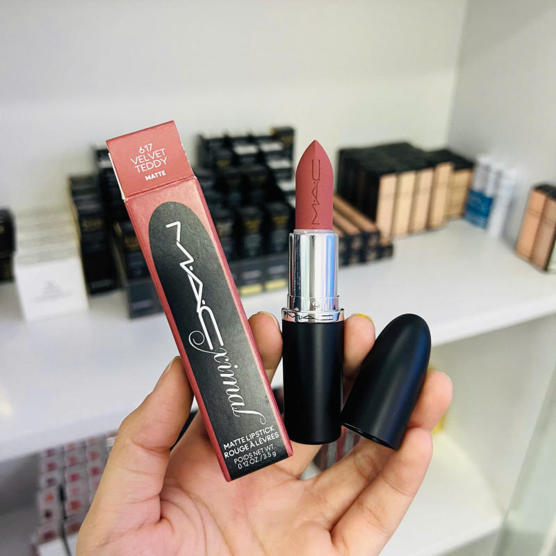 MAC Macximal Matte 617 Velvet Teddy – Thỏi son huyền thoại với sắc nâu cam đất thời thượng, tôn da, dễ dùng, phù hợp với mọi phong cách. Chất son lì mịn, không gây khô môi, bền màu suốt nhiều giờ.