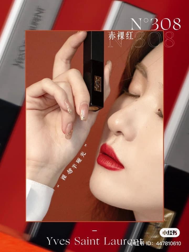 - Son YSL The Slim Velvet Radical 308 mang sắc đỏ đậm (Radical Chili) sang trọng, quyến rũ.