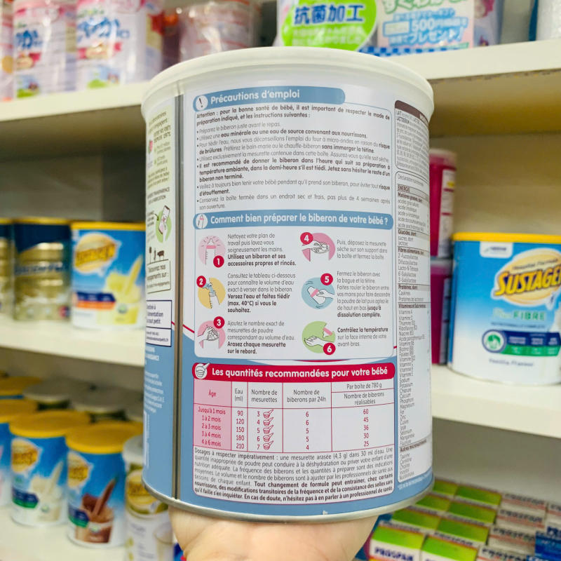 Thành phần: lait écrémé, huiles végétales (oléine de palme, colza, coprah, tournesol); protéines solubes de lait, lactose, amidons, maltodextrine, citrates de potassium et de calcium; chlorures de magnésium, de calcium et de sodium; émulsifiant: lécithine de soja; ferments lactiques (S. Thermophilus); vitamines C, E, niacine pantothénate de calcium, A, B1, B76, B2, acide folique, D, K1, B12, biotine, L-phénylalanine, phosphate de calcium, bitartrate de choline, taurine, sulfates ferreux, de zinc, de cuivre et de manganèse; inositol, L-histidine, L-carnitine, antioxydant: palmitate de L-ascorbyle; culture de bifidus (B. Lactis); iodure de potassium, sélénate de sodium