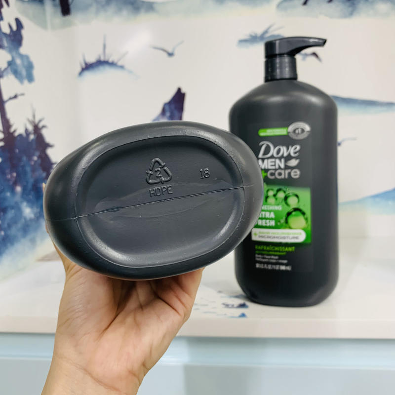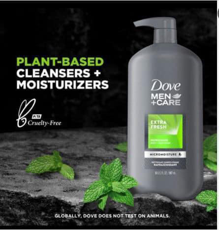 Sữa tắm Dove Men+Care Refreshing Extra Fresh được PETA chứng nhận không độc hại và được sản xuất bằng 100% chai nhựa tái chế.