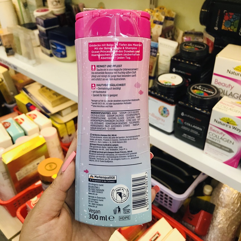 -Công thức bổ sung dịu nhẹ của Balea Shower & Shampoo Ocean Princess nuôi dưỡng và làm sạch làn da tươi trẻ với hương trái cây ngọt ngào và bảo vệ da khỏi bị khô.