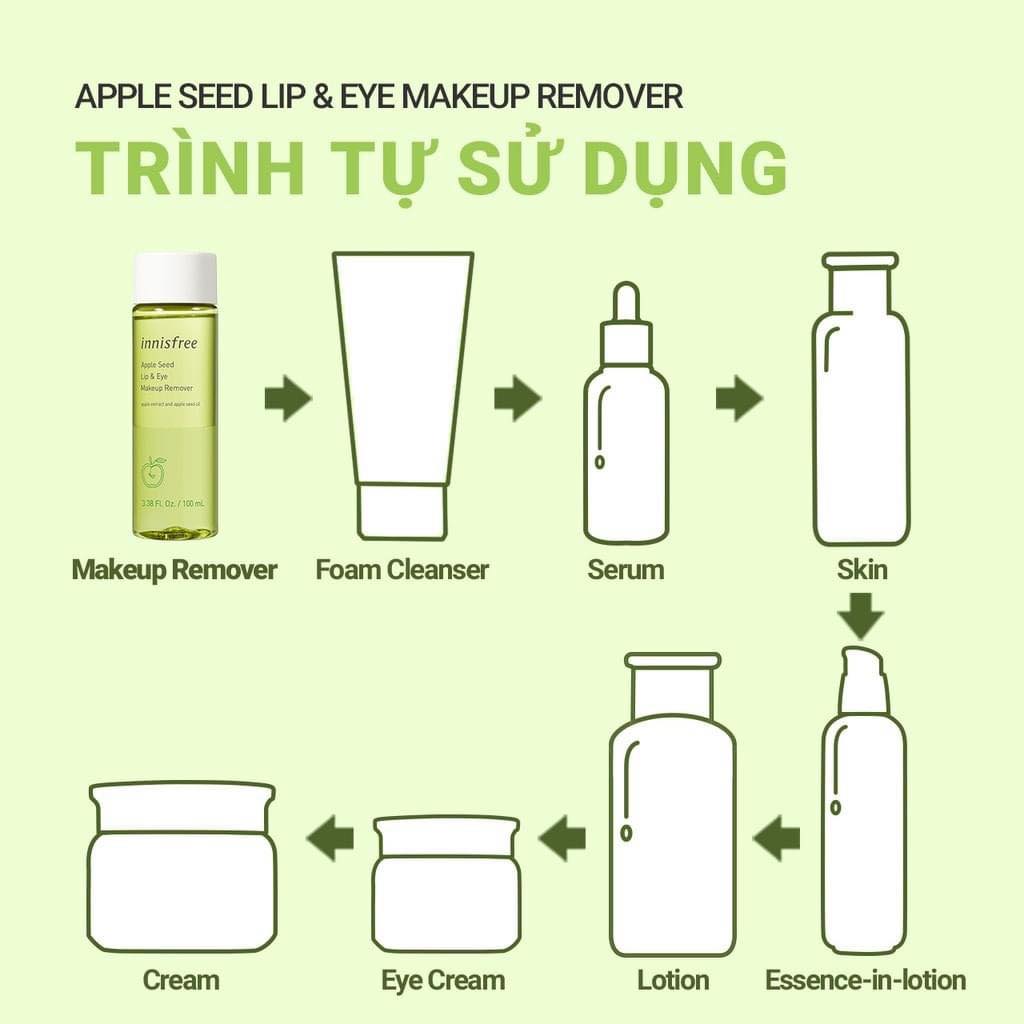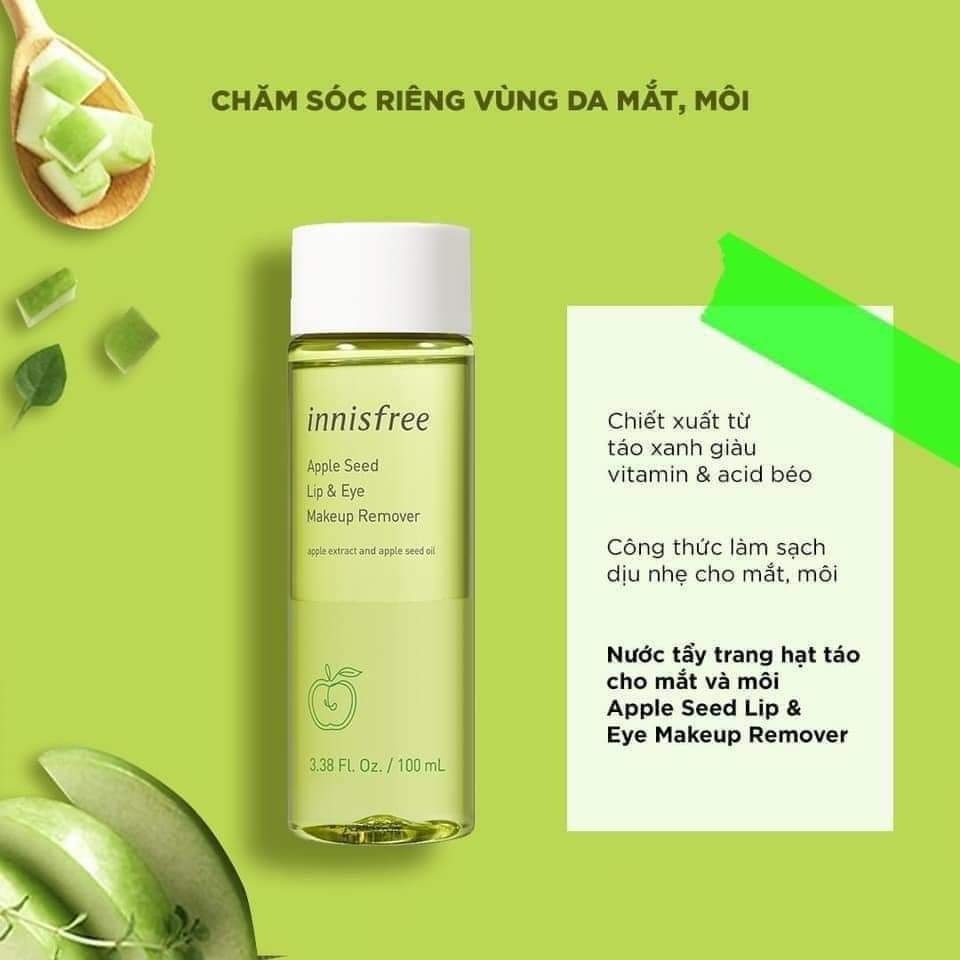 Dầu Tẩy Trang Mắt & Môi Apple Seed Innisfree -100ml là tẩy trang dạng dầu của Thương hiệu Innisfree với thành phần từ nước ép táo xanh và trà xanh giúp nhẹ nhàng tẩy sạch lớp trang điểm mà vẫn không gây kích ứng da, làm trắng sáng, chống oxy hóa, và trẻ hóa làn da.