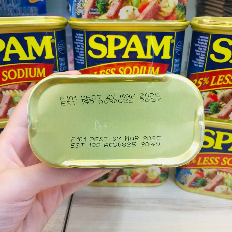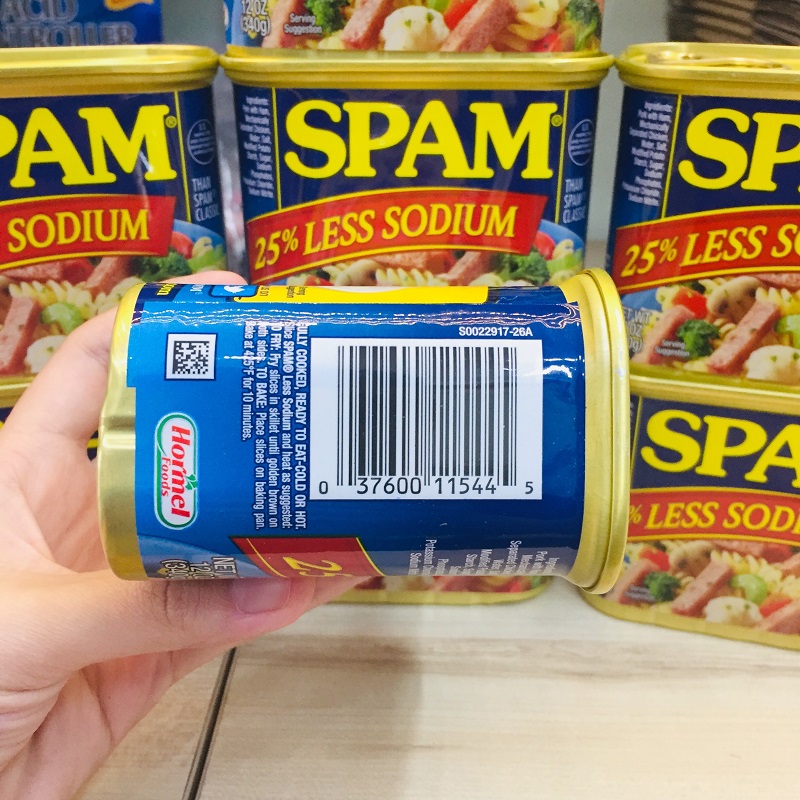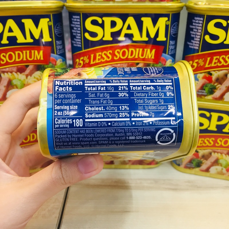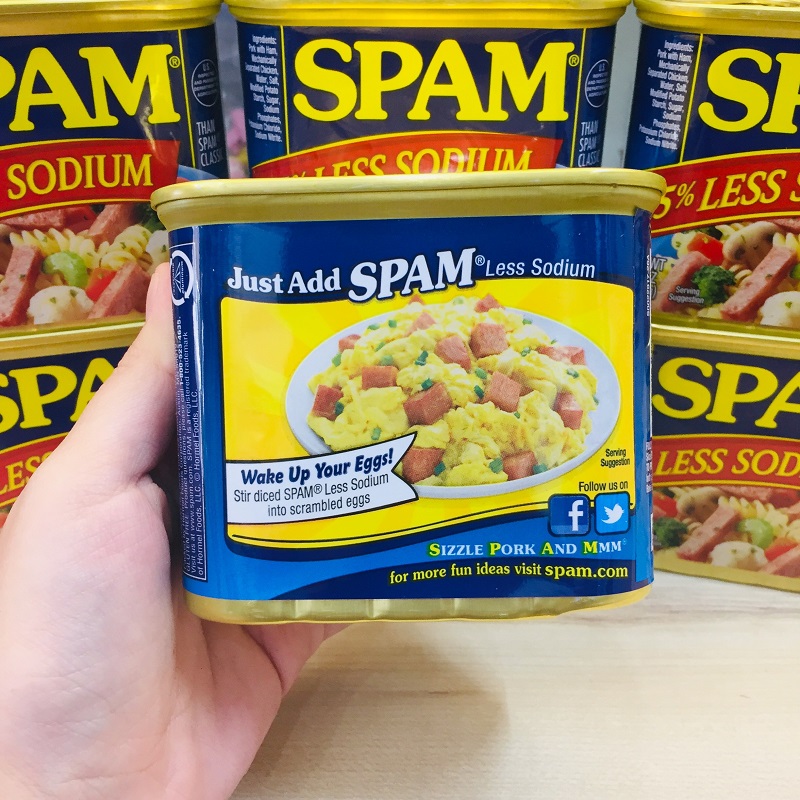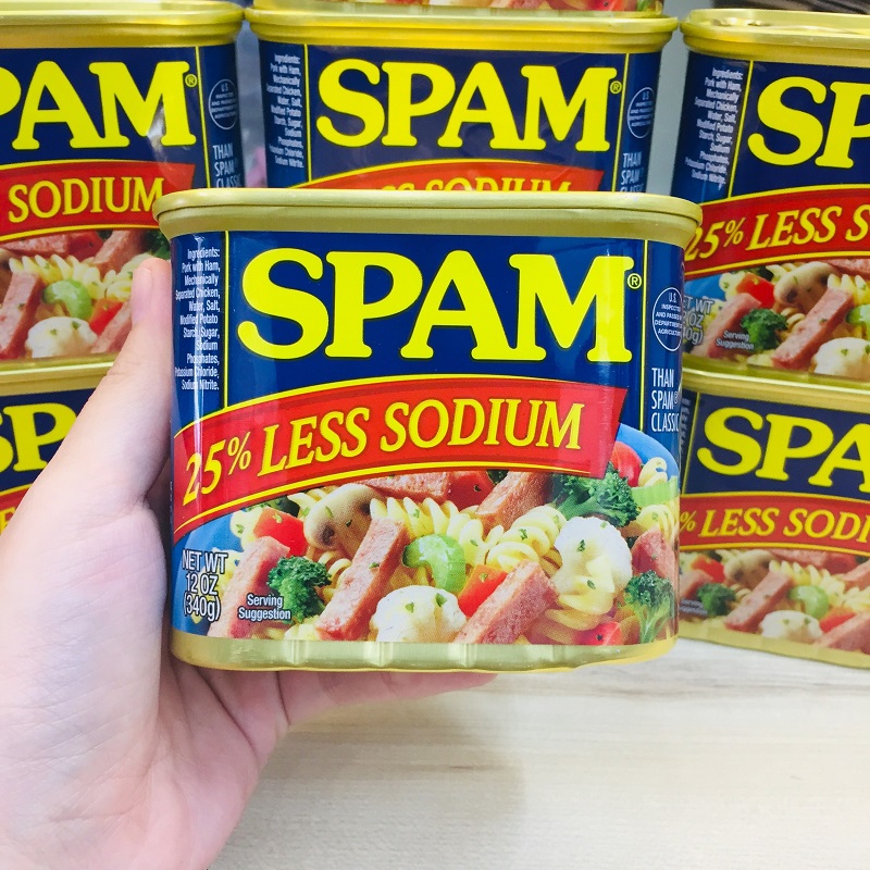 - Thịt hộp Spam 25% Less Sodium của Mỹ có thể ăn liền dùng trong mâm cơm hàng ngày, ăn kèm với bánh mì, sa lát, mì gói hoặc bún tươi đều rất ngon. Bạn có thể nướng hoặc chiên từ 5-10 phút mà không cần phải thêm gia vị .