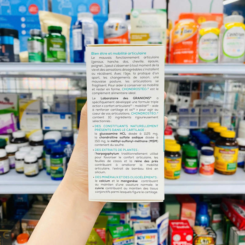 Granions Chondrostéo 90 viên là viên uống hỗ trợ xương khớp đến từ Pháp, được phát triển dành riêng cho người gặp vấn đề về sụn khớp, đau nhức xương khớp hoặc muốn bảo vệ hệ vận động. Công thức kết hợp Glucosamine, Chondroitin, MSM và chiết xuất thiên nhiên, giúp tái tạo sụn khớp, giảm viêm, tăng cường độ linh hoạt.