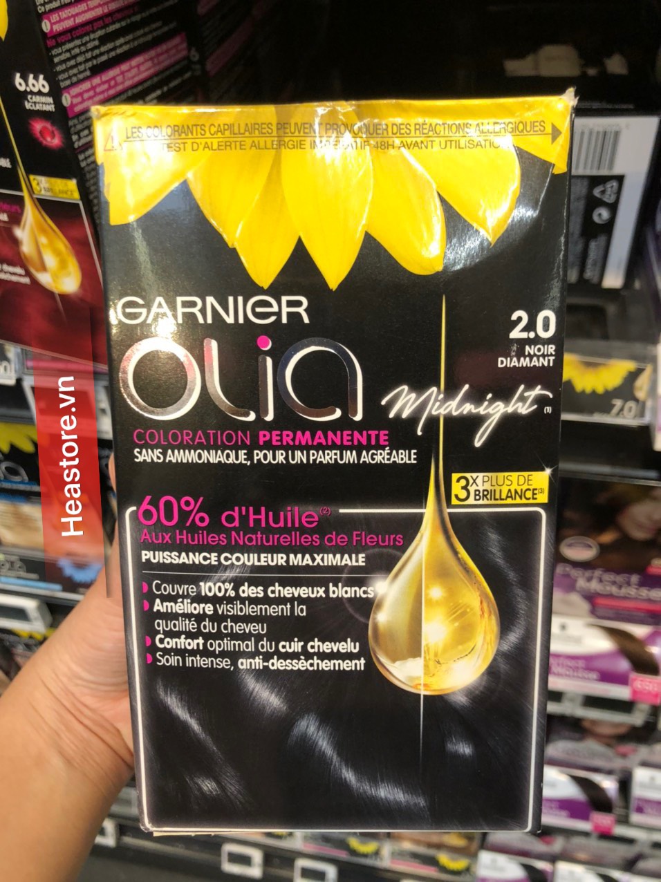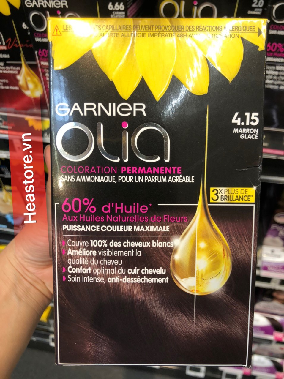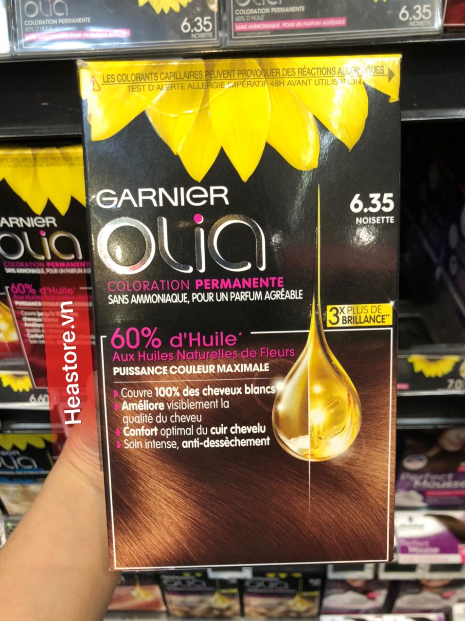 Thuốc nhuộm tóc vĩnh viễn Garnier Olia với công thức chứa 60% dầu hoa tự nhiên, không chứa amoniac cho một hương thơm dễ chịu. Sản phẩm này sẽ cải thiện rõ rệt chất lượng của tóc, giúp tóc óng ả và mượt mà hơn tới 35% **.