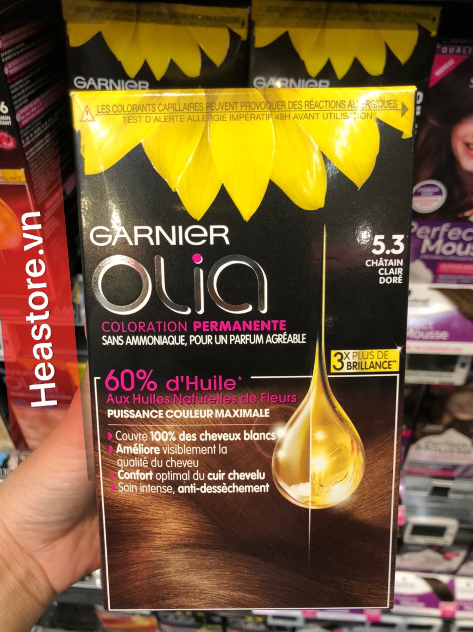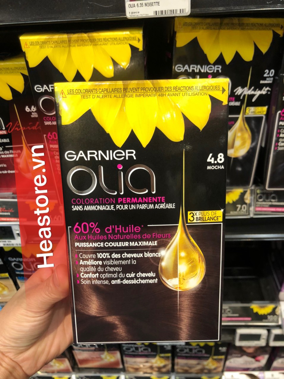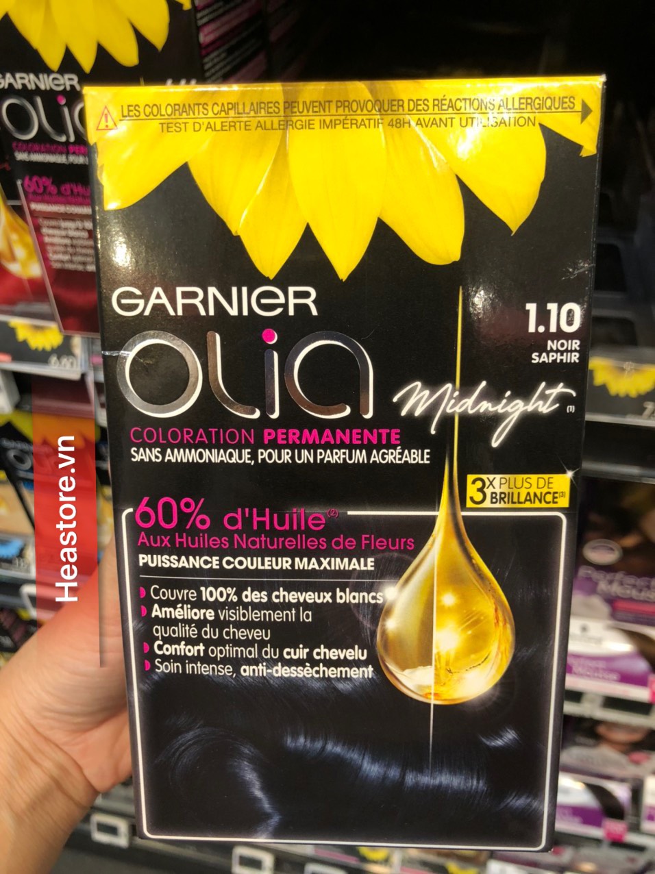 Thuốc nhuộm tóc vĩnh viễn Garnier Olia với công thức chứa 60% dầu hoa tự nhiên, không chứa amoniac cho một hương thơm dễ chịu. Sản phẩm này sẽ cải thiện rõ rệt chất lượng của tóc, giúp tóc óng ả và mượt mà hơn tới 35% **.