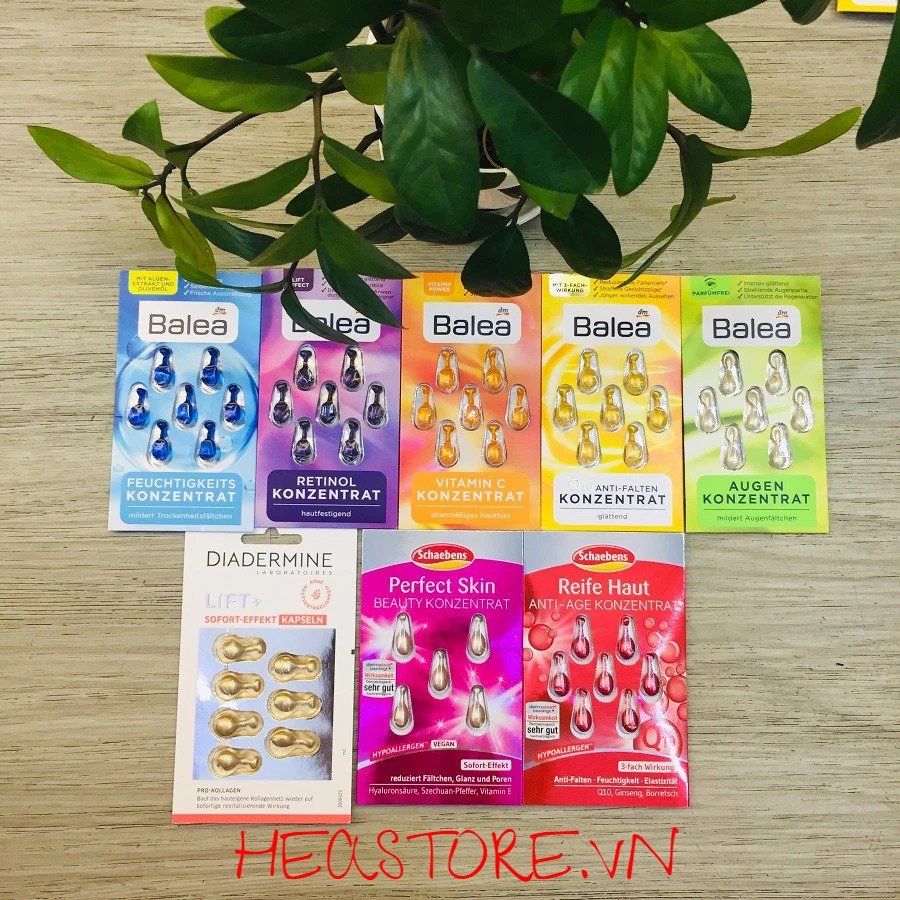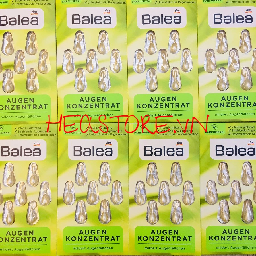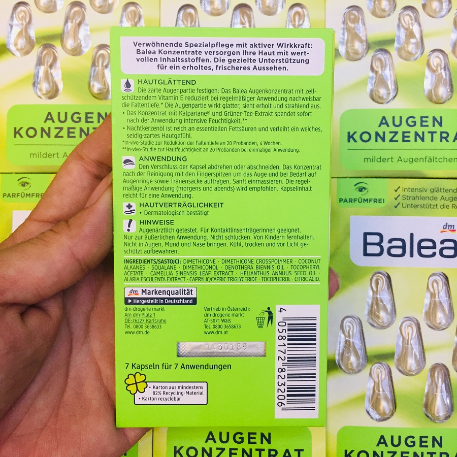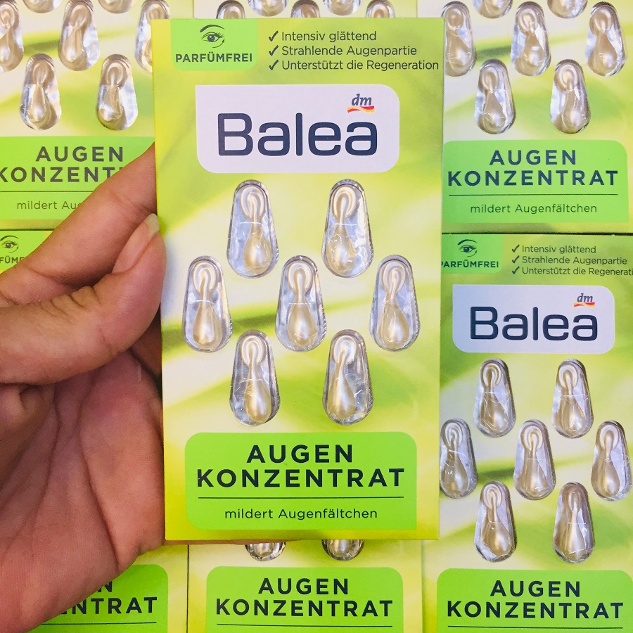 Viên nang Balea Augen Konzentrat có thành phần chiết xuất trà xanh, vitamin E và dầu hoa anh thảo. Giúp cung cấp độ ẩm và dưỡng chất nuôi dưỡng vùng da quanh mắt. Làm giảm độ sâu của các nếp nhăn, thâm, chân chim,… trả lại diện mạo trẻ trung rạng rỡ.