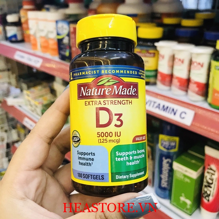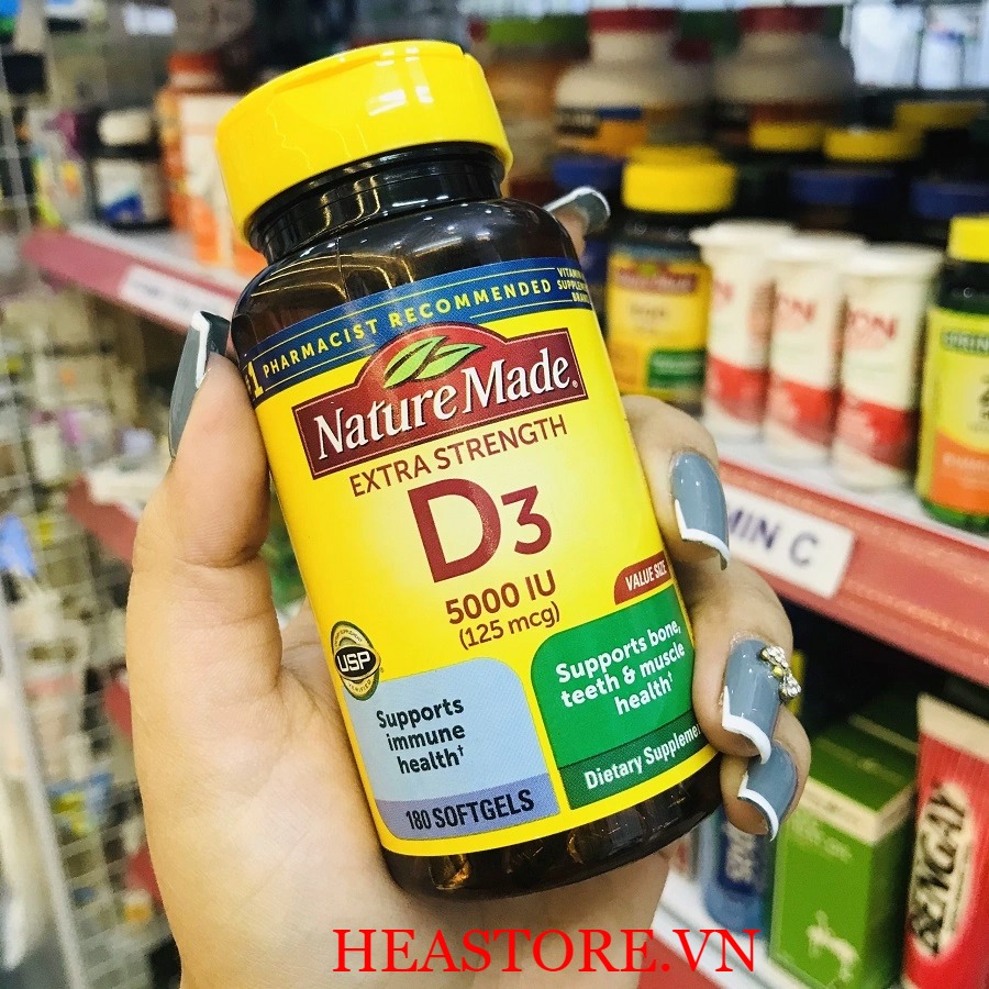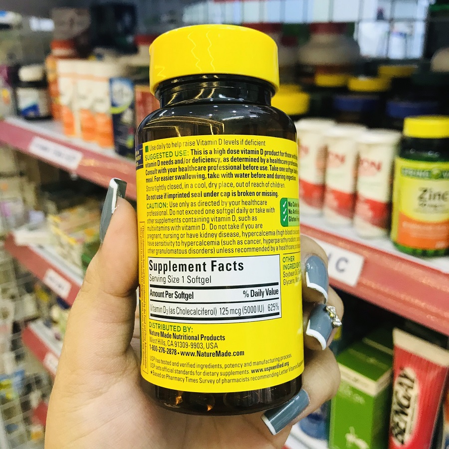 Ngoài ra nếu chúng ta không đủ điều kiện tắm nắng mỗi ngày. Nguồn thức ăn không cung cấp đủ lượng vitamin D3 cơ thể cần. Chúng ta có thể chọn giải pháp đơn giản như là bổ sung viên uống bổ sung D3 Nature Made Vitamin D3 5000IU.