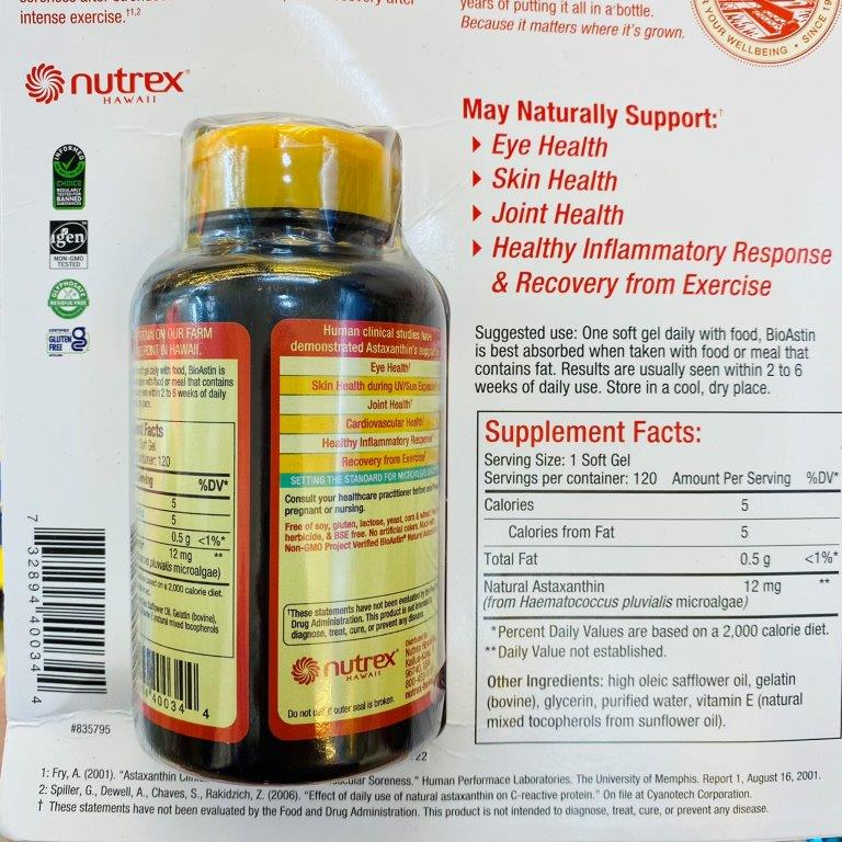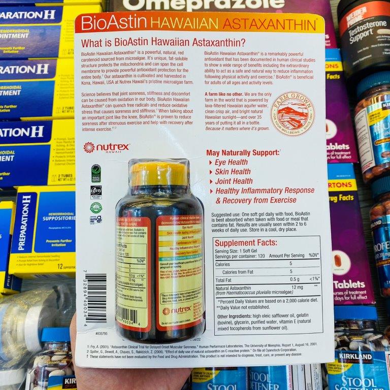 Các Astaxanthin Hawaii trong BioAstin 12 mg cung cấp cho các tế bào cơ thể chống oxy hoá, kháng viêm sau khi tập thể dục, vận động mạnh.