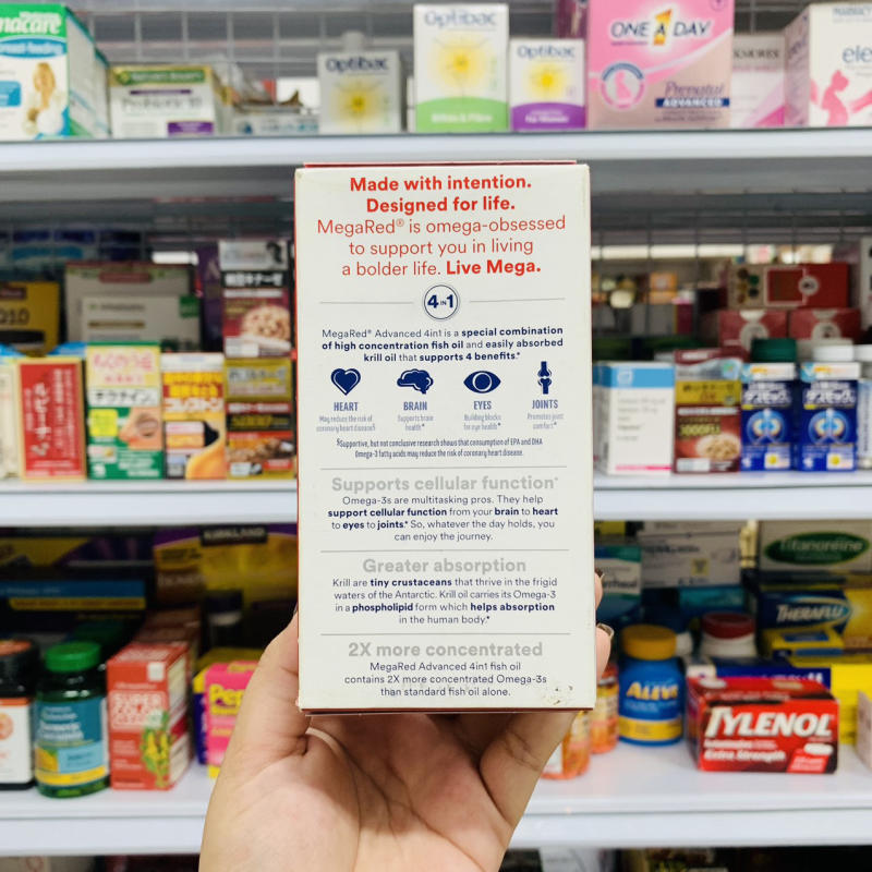 MegaRed Advanced 4 in 1 là sự kết hợp đặc biệt giữa dầu cá nồng độ cao và dầu nhuyễn thể hấp thụ cao có hàm lượng Omega 3 cao gấp 2 lần so với chỉ là dầu cá tiêu chuẩn. Sản phẩm bổ sung Omega-3 tiên tiến của Schiff cho đến nay mang đến cho bạn bởi một trong những công ty hàng đầu trong lĩnh vực bổ sung omega 3, MegaRed. Công thức tiên tiến này không chỉ giúp ích cho tim mạch. MegaRed 4in1 hỗ trợ và cung cấp lợi ích cho 4 khu vực quan trọng trong cơ thể là Tim, Khớp, Não và Mắt.