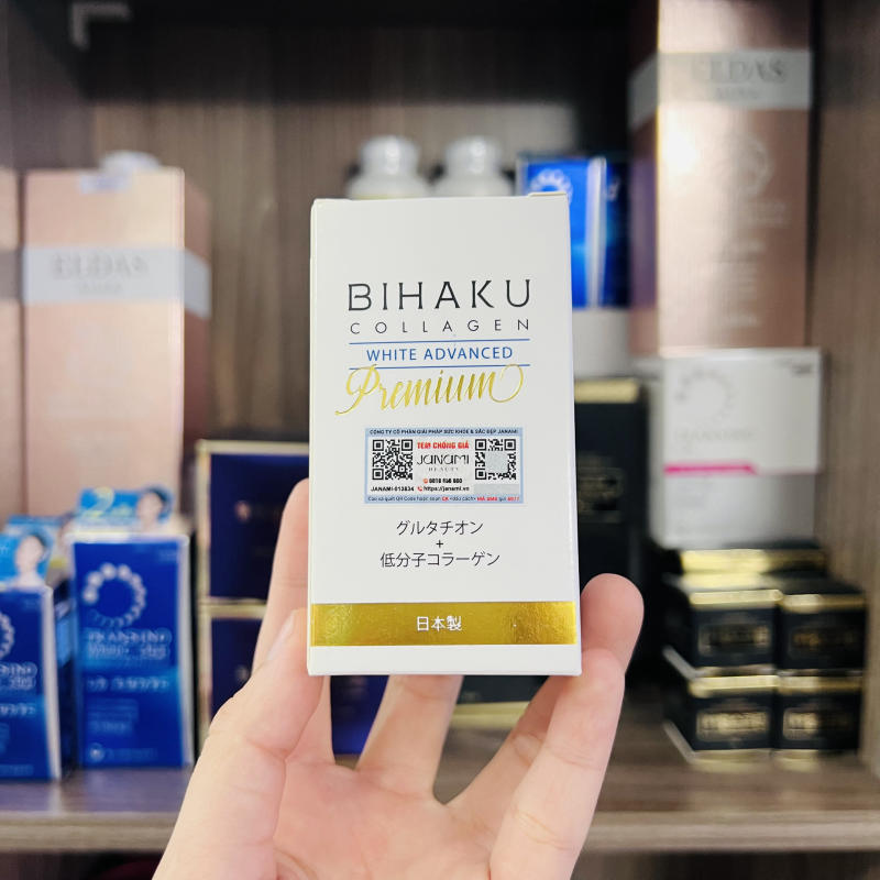 Viên uống trắng da Bihaku Collagen Premium là phiên bản nâng cấp của viên uống Bihaku Collagen, được nhập khẩu 100% từ Nhật Bản, được sản xuất bằng nguồn nước tinh khiết từ núi Phú Sĩ, kết hợp thêm công nghệ làm đẹp tiên tiến, cùng nhiều dưỡng chất thiên nhiên quý hiếm, giúp dưỡng trắng da từ bên trong, bảo vệ làn da một cách toàn diện, ngăn ngừa sạm nám hiệu quả, sản phẩm được nhiều chuyên gia nổi tiếng Nhật Bản khuyên dùng.