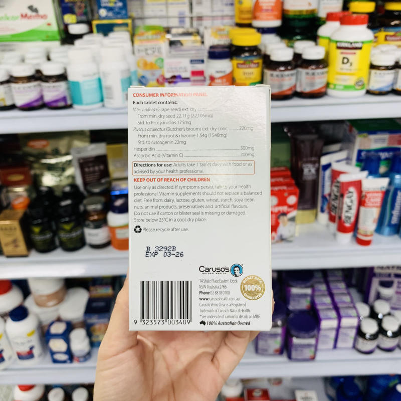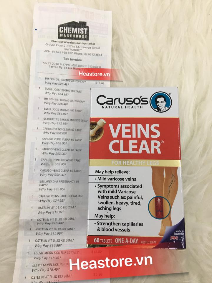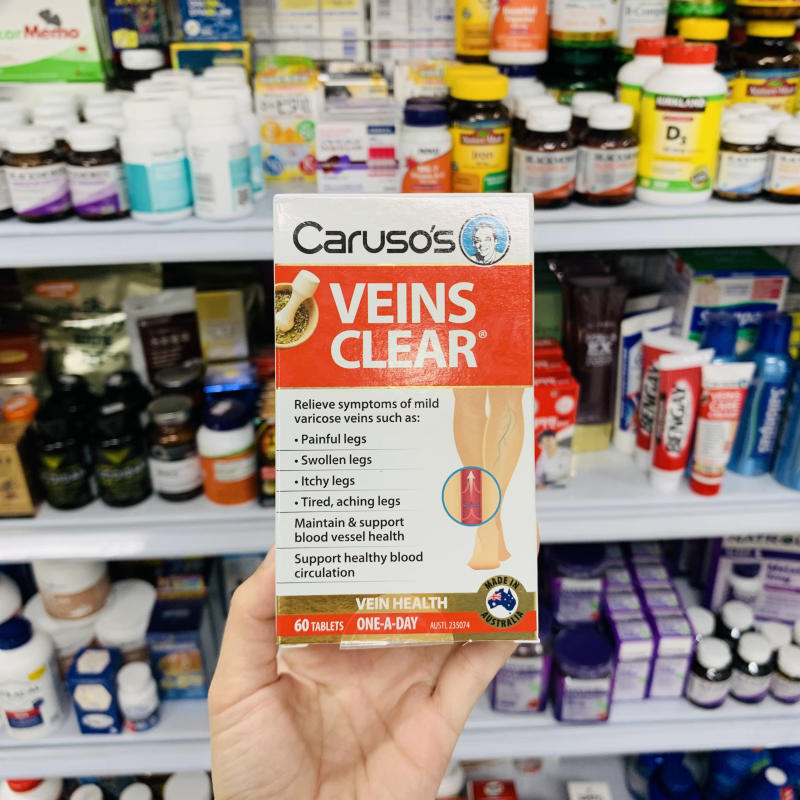 - Caruso’s Veins Clear 60 viên của Úc được xây dựng để làm giảm và hỗ trợ điều trị: Mỏi chân, đau chân, nặng nề, sưng phù, suy tĩnh mạch và tĩnh mạch hình mạng nhện.