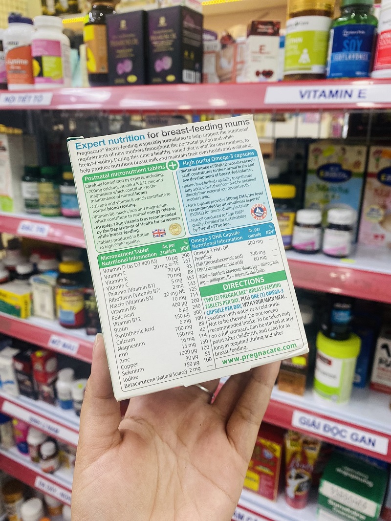 - Pregnacare Breast-feeding chứa chính xác 10mcg vitamin D, đầy đủ các dinh dưỡng bao gồm 700mg canxi và 300mg DHA, mức độ chính xác khuyến cáo của các chuyên gia quốc tế. giúp não và mắt bé phát triển, cung như giú xương chác khỏe.